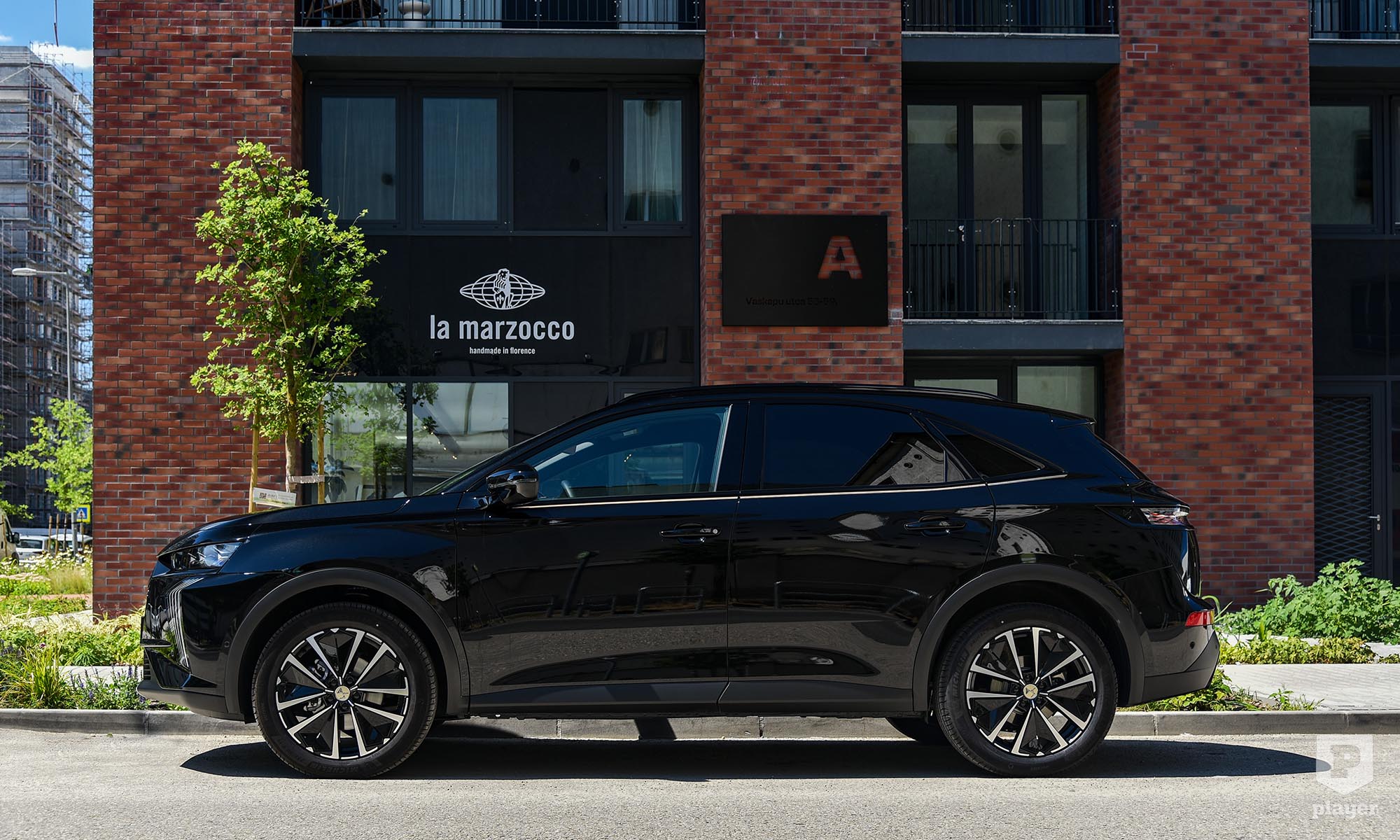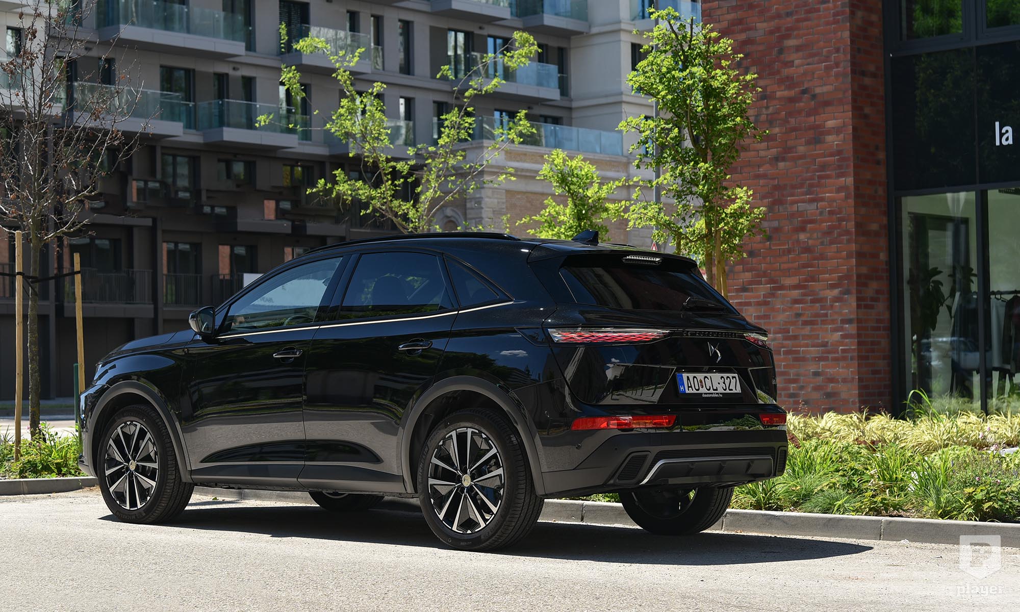 A DS 7 a márka első önálló típusa, amelyiknek nincs közvetlen Citroën-változata. 2017-ben mutatták be akkor még DS 7 Crossbackként, és bár azóta frissítettek rajta – akkor hagyták el a nevéből a Crossbacket –, már koros modellnek számít. Erről viszont legfeljebb csak az árulkodik, hogy nincs világító emblémája, sőt, még fénycsík sem köti össze a fényszóróit, ezeket leszámítva azonban még mindig frissnek hat. Jók az arányai, és ami a karakterét adja, érdekesek a részletei. Az apró rombuszok a hűtőmaszkon, az első lökhárítóba integrált menetfénycsíkok és a gyönyörű fénymintázatú hátsó lámpák a fekete gyöngyházfényezéssel különösen jól érvényesülnek.