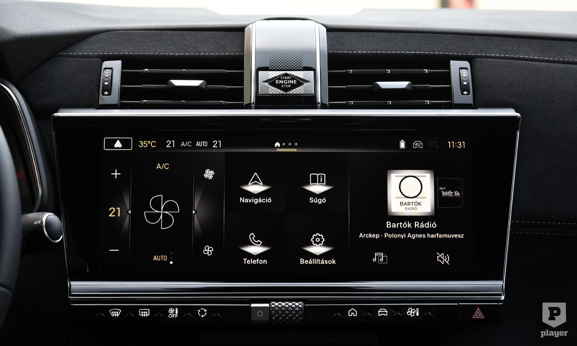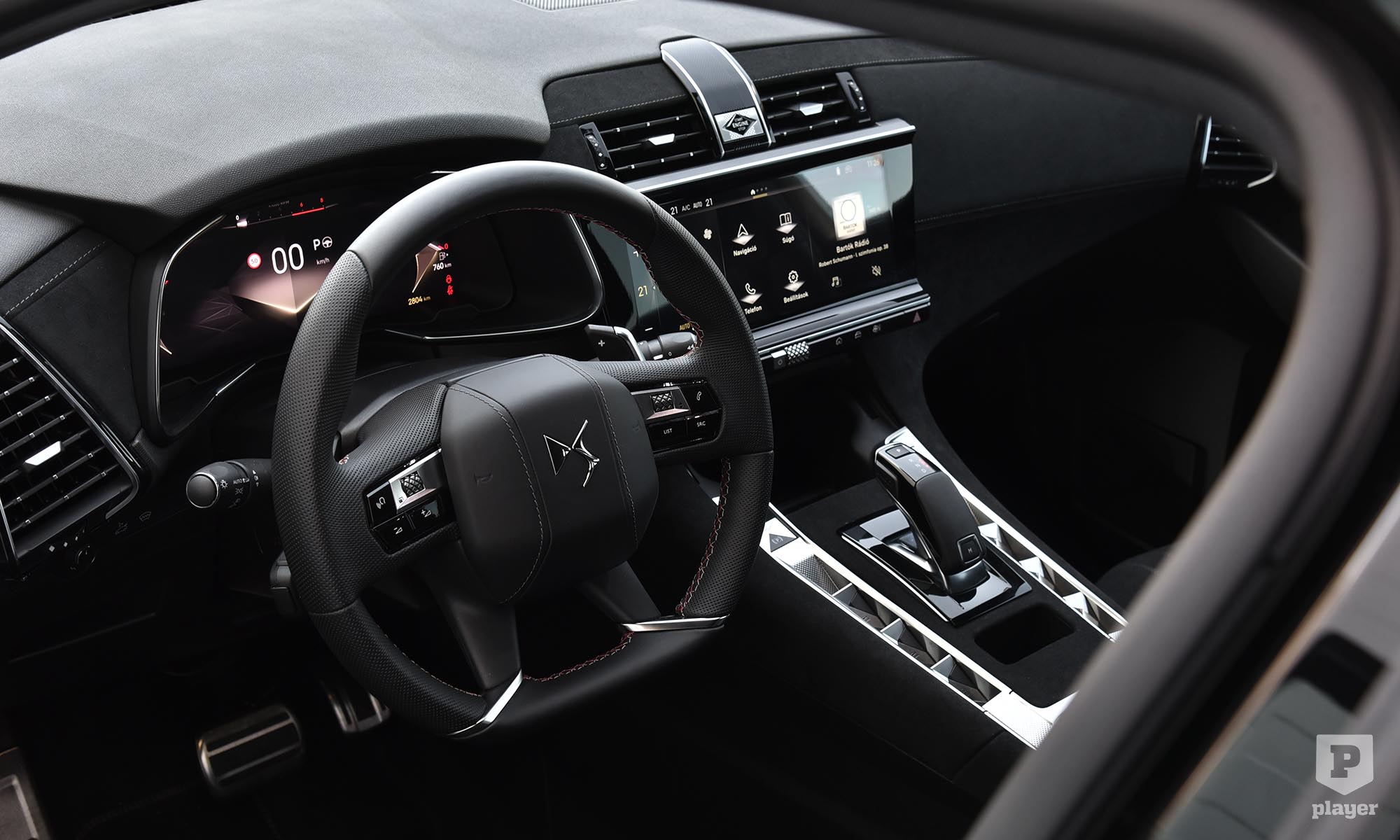 Rombuszformákat az utastérben is találunk, itt azonban nem olyan erőltetettek, mint a DS 3-asban. A műszerfal klasszikus kialakítású – ami nem unalmast jelent, itt is odafigyeltek a részletekre –, a kormány egy kis alsó lapítást leszámítva kerek, különálló a mögötte lévő és a központi monitor, a középkonzolból mered a váltó előválasztó karja. Önálló klímapanel sajnos nincs, tekerős hangerőállító viszont van. Korábban egyedi részlet volt a start-stop gomb fölött kiforduló mutatós óra, erre már nem érdemes várni, nincs ott. A start-stop viszont igen, és ebben az autóban egy másfél literes, négyhengeres turbódízelmotort indít be.