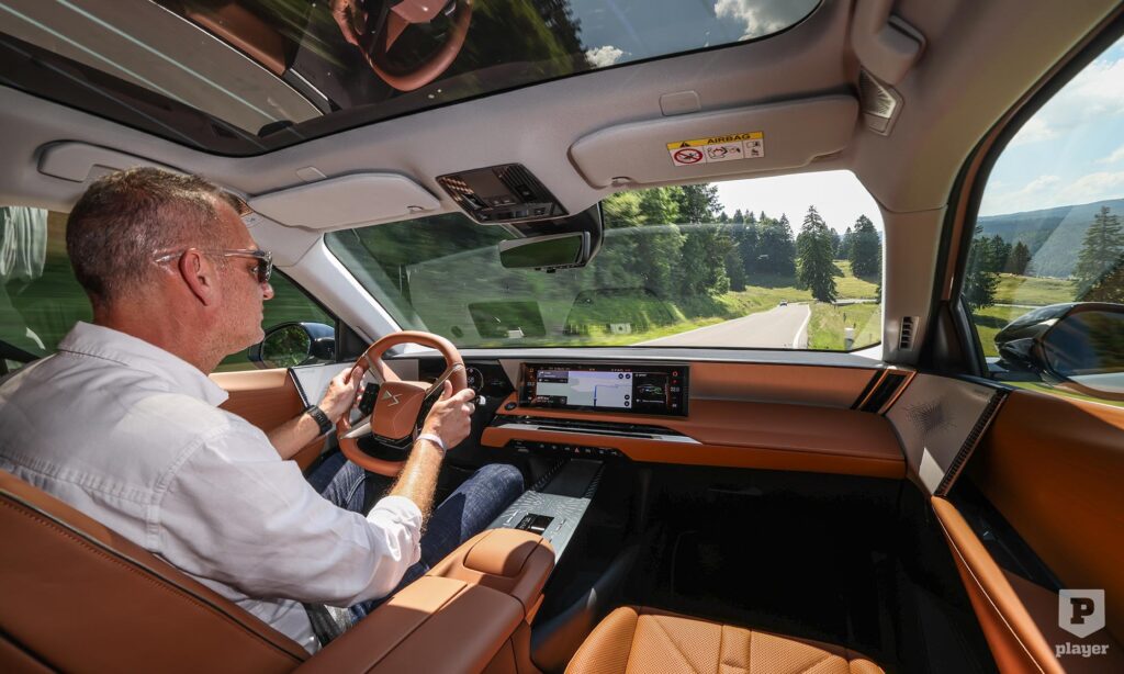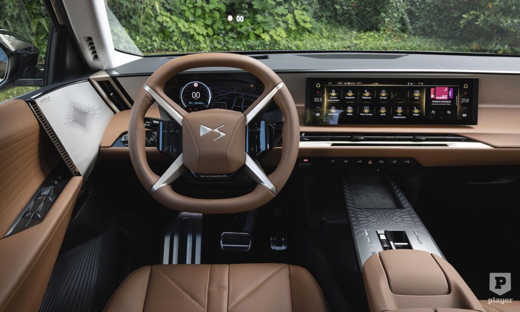 A Tesla olyan, mint egy jól sikerült Excel-táblázat: logikus, praktikus, de nincs benne élet. Ehhez képest a DS N°8 minden érzékszervedre hat. Kényelmes kanapéra huppansz, ahol a nyakadra meleg levegő fújnak a ventilátorok. Ez a kabriókban megszokott részlet segít abban, hogy télen is kellemes legyen a hőérzet, miközben kevesebb energia szükséges az utastér fűtéséhez. Különleges részlet az X küllős kormány, ami csak azért nem uralja a figyelmet, mert annyi minden más is van, amin szívesen időzik el a szemem.