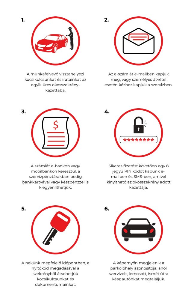 - Miután a szükséges javításokat a szerviz elvégezte gépkocsinkon, autónkat ugyanígy, az okosszekrény igénybevételével, vagy akár személyesen is átvehetjük. Előbbi esetben a munkafelvevő visszahelyezi kocsikulcsunkat és iratainkat az egyik üres okosszekrény-kazettába.