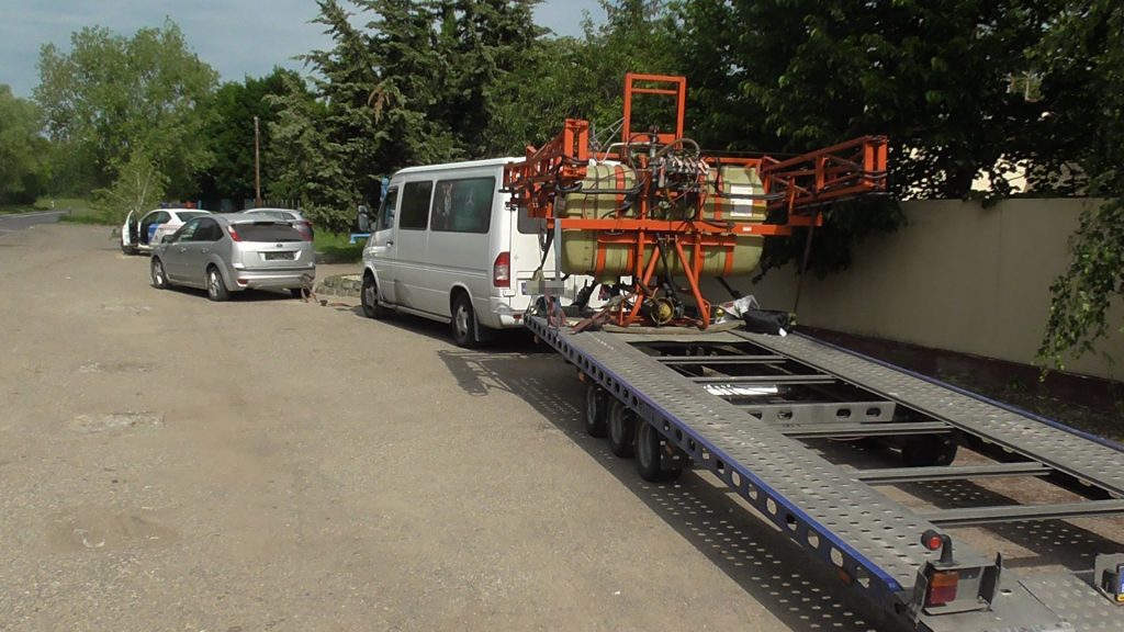 egy Ford Focus által vontatott Mercedes-Benz Sprinter által vontatott utánfutót, rajta egy mezőgazdasági munkagéppel.