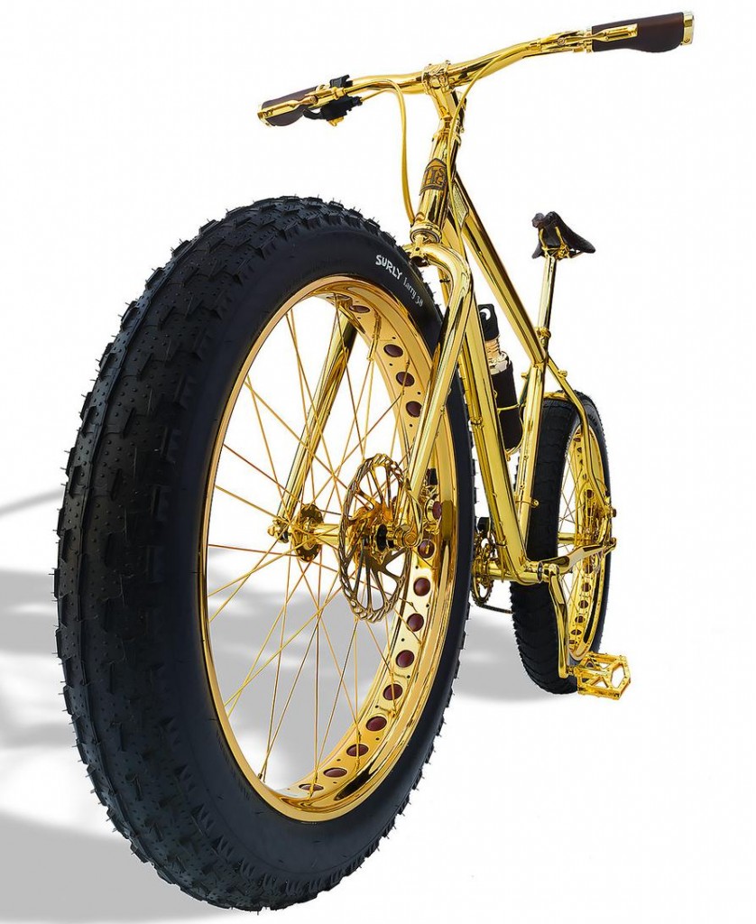 Ha valaha downhillezésre adnánk a fejünket, csakis ezzel a bringával mozdulnánk ki a Normafához: a The House of Solid Gold ékszerüzlet mountain bike-ját kormánytól a küllőkig huszonnégy karátos arany borítja, az izgalmas kiegészítőkről pedig a Shimano váltó vagy a DT Swiss teleszkóp helyett a hatszáz fekete gyémánt, ötszáz zafír és a krokodilbőrrel bevont ülés – na meg a szintén bőrrel bevont kulacs – gondoskodik.
