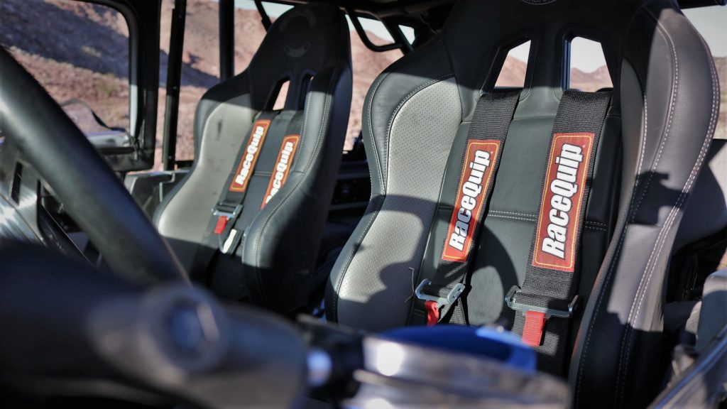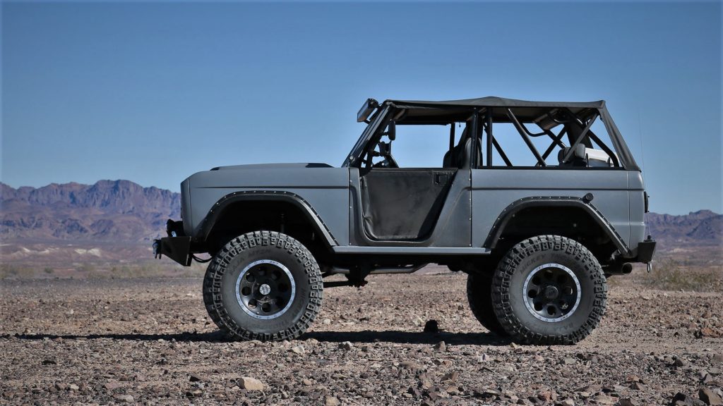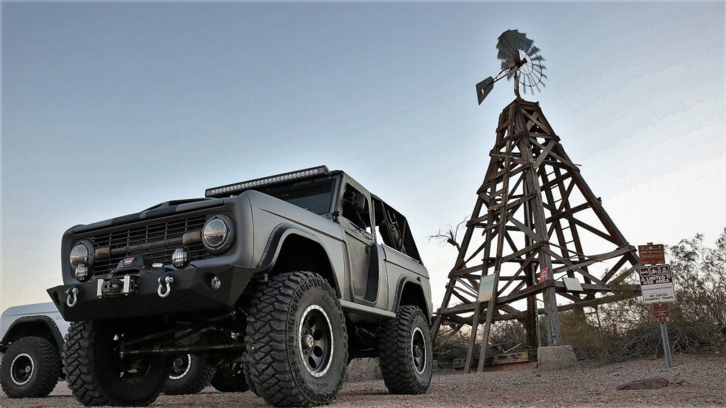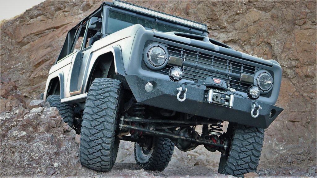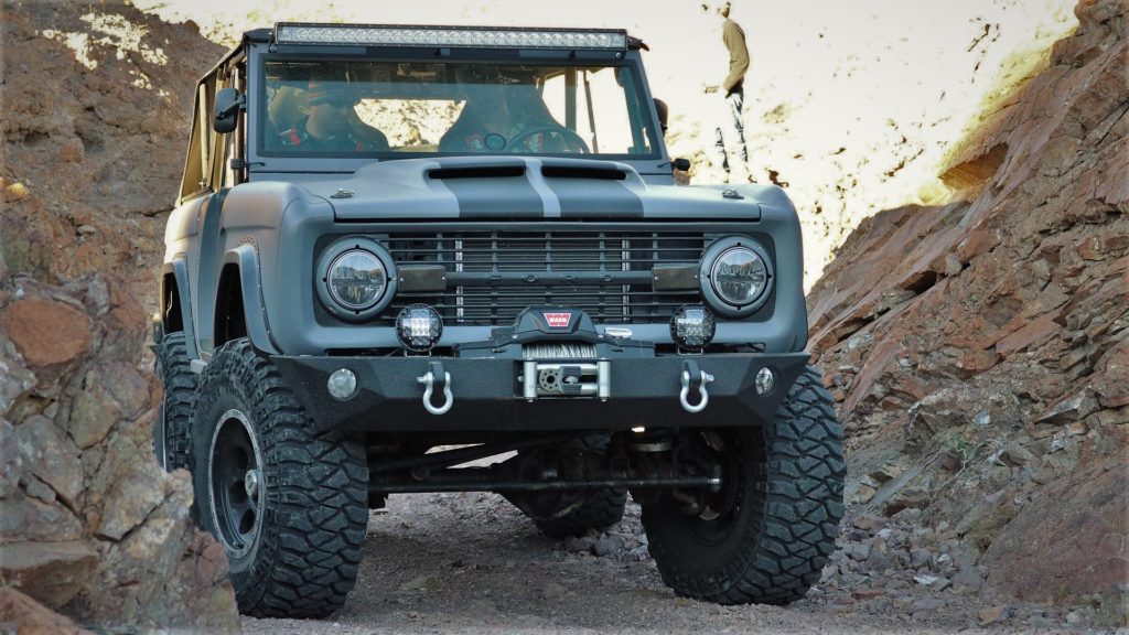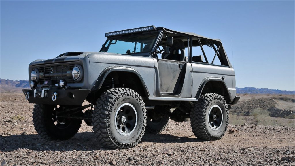 A Bronco ezért ugyanolyan szürke fényezést kapott, mint a Mustang, és mivel terepjáróról van szó, olyan fújtak fel rá, ami a karcolásokkal szemben is ellenállóbb. A csörlő, a spéci felfüggesztés és a túlméretes kerekek még alkalmasabbá teszik a terepezésre, a kerek LED-es fényszórók és a tetőre szerelt LED-es lámpa pedig jó szolgálatot tesz, ha rád esteledik a sivatag közepén.