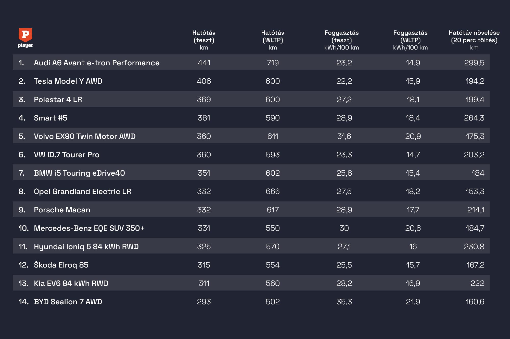Szorosan mögötte a Tesla Model Y Premium AWD végzett, bár „csak” 406 km-t ment egy töltéssel, a fogyasztása (22,2 kWh/100 km) a teljes mezőny legjobbja volt, és ezt ráadásul összkerékhajtás mellett érte el. A harmadik és negyedik helyen a pontozás (és nem a hatótáv) szerint Volkswagen ID.7 Tourer Pro és a kínai Smart #5 osztozott, utóbbi szintén kiemelkedő töltési teljesítményt mutatott.