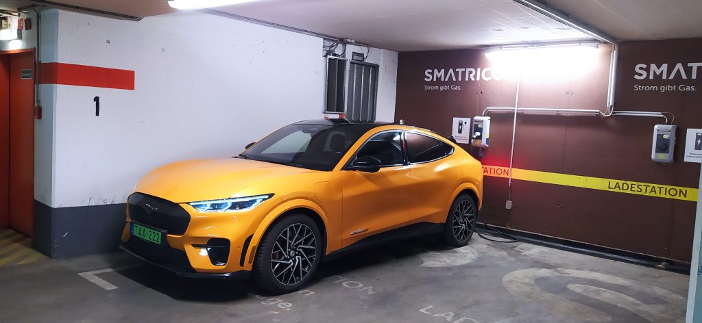 Szerencsénk volt: a bécsi mélygarázsban most pont üres volt mind a két konnektor. Azzal viszont már kevésbé volt szerencsénk, hogy Smatrics időalapú töltésre árazta be a töltőit, és hiába tudott volna a wallbox 22 kW-ot is leadni, ha a Mustang Mach-E AC-csatlakozóról csak 11 kW-ot tud felvenni.