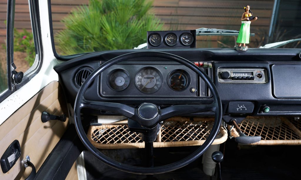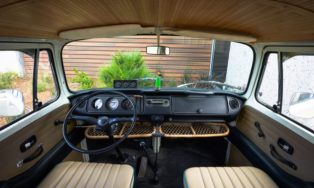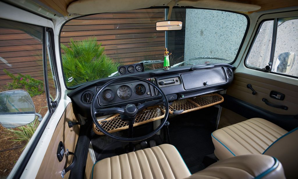 A belső tér is teljesen olyan, mint a hetvenes évekbeli kisbuszban, még a hosszú váltókart is megtartották, de már nem fokozatok, hanem az előre és hátramenet közt lehet vele váltani.