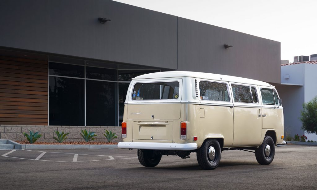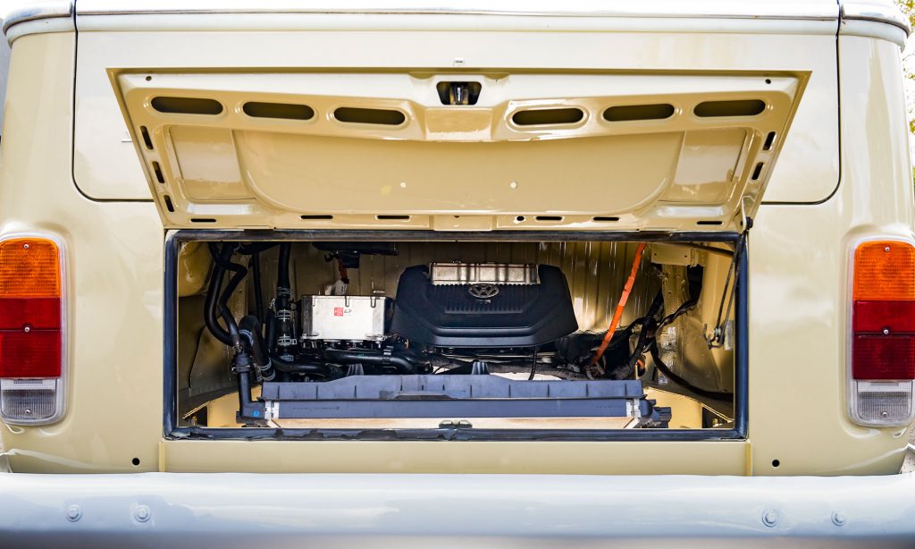A Volkswagen amerikai képviseletének megbízásából az EV West műhelyében építették meg ezt az 1972-es Type 2-es kisbuszt. A tökéletesen felújított karosszéria ezúttal teljesen elektromos hajtást rejt, az eredeti 60 lóerős, léghűtéses négyhengeres benzinmotor helyére az e-Golf modern 136 lóerős villanymotorja került.
