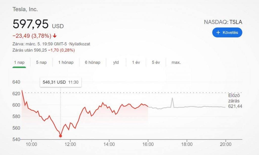 Az igazság ezzel szemben az volt, hogy a Tesla-részvények árfolyama így is 6 százalékot esett egyetlen óra alatt.