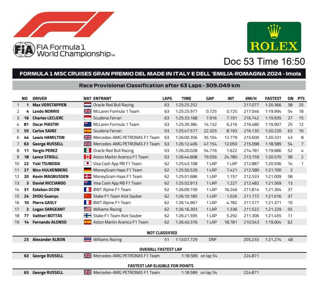 Harmadikként Charles Leclerc-t intették le, aki a legendás Michael Schumacher óta az első Ferrari-pilóta lett, aki Imolában dobogóra állhatott (2006→2024).