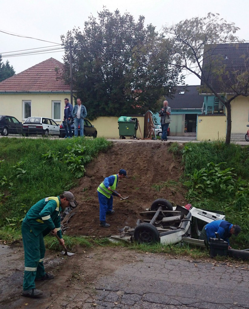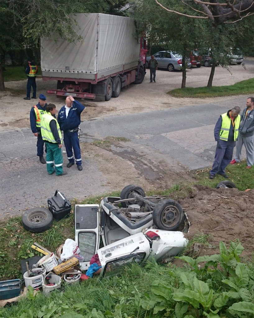 Érden kigurult egy lisztszállító teherautó egy udvarról, és legurult egy partfalon, amely alatt egy Volkswagen Caddy állt. Szerencsére nem ült benne senki, de többet már nem is fog.