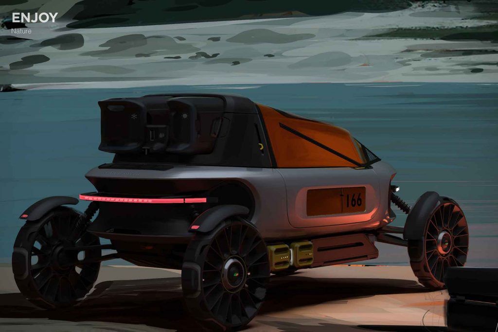 A Back Packer egyszerre egy miniatűr, kétszemélyes terepjáró, valamint szálláshelyként is használható a nagy semmi közepén. A kocsi felső része egy kis sátorrá alakítható át, és tartozik hozzá egy kifeszíthető napelem is, amivel feltöltheted az elektromos jármű akkumulátorait.