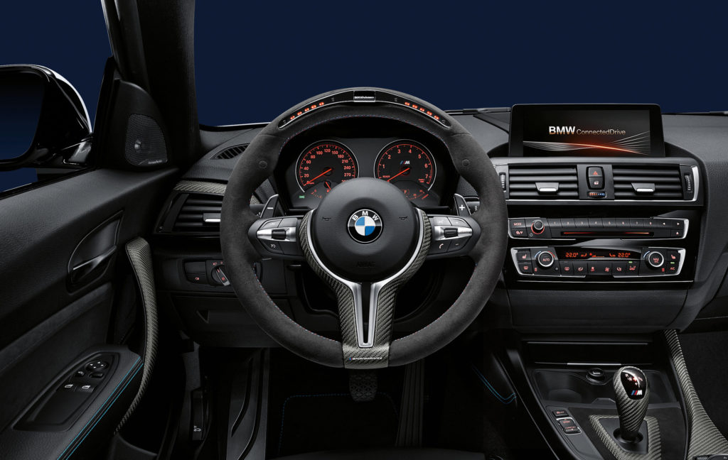 Széles a választék az utastéri elemekből is. Belül minden díszítés szénszálas anyagból készülhet, a vaskos kormánykereket pedig velúrbőr borítja, hogy biztosan ne csússzon meg rajta a kezed. A tetejére pedig a versenyautókból ismerős középállást jelző varrás, vagy akár a szuper-sportkocsikban látott, fordulatszámot jelző LED-ek is kérhetők.