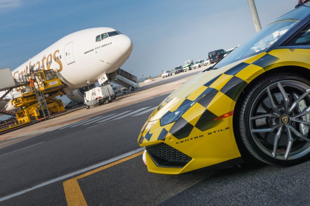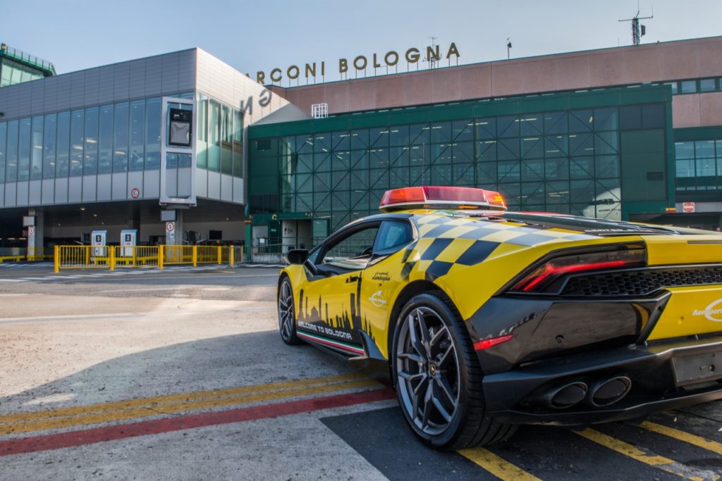 Nem ez az első alkalom, hogy egy Lamborghini vezeti fel a gépeket a bolognai reptéren. 2013-ban, a márka alapításának ötvenedik évfordulójára egy Aventador öltötte fel a munkaruhát, a Lamborghini pedig külön bemutatótermet is működtet a repülőtéren. Az elegáns környezetben egy Huracán és egy Aventador látható, valamint a márka ruházati termékeit és ajándéktárgyait veheted meg, de a Lamborghini gyár és múzeum látogatását is itt foglalhatod le. Sant’Agata Bolognese ugyanis csak 25 percre, fél óra autózásra van a reptértől.
