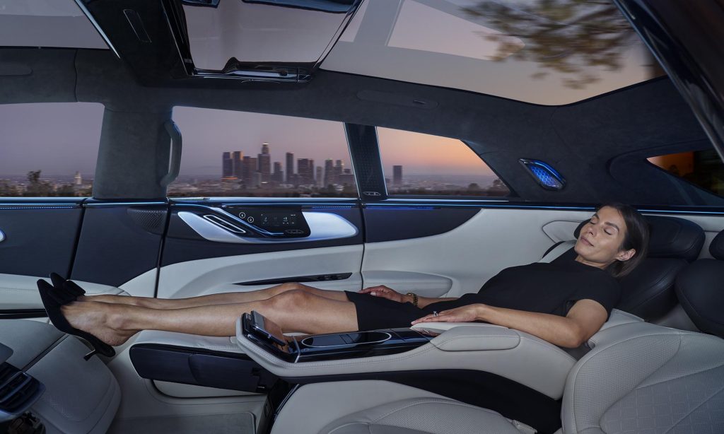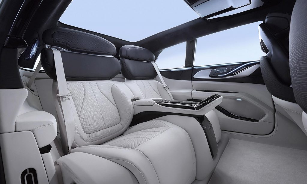 A hátsó sorba két szuperkényelmes masszázsfotelt terveztek, és az itt ülők élvezhetik a 27 colos szélesvásznú moziképernyőt is, ami a tetőből hajtható le.