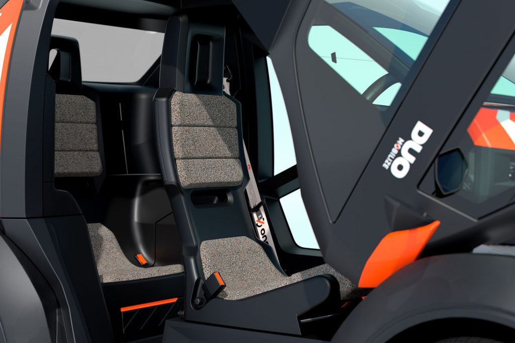 A Duóba már ketten is beleférnek – egymás mögé, mint a Renault Twizyben. A kétüléses, 2,43 × 1,3 × 1,46 méteres villanyautócska legnagyobb szuperképessége, hogy egy szabvány parkolóhelyre három is elfér belőle, keresztben leállítva. A Mobilize a városi törpeautóval újra emlékezteti a sokszáz lóerős luxus-villanyautós világot arra is, mennyire fontos a gyakran elfeledett fenntarthatóság ebben az egész e-mobilitási átállásban. A Duo a fejlesztők tervei szerint 50%-ban eleve újrahasznosított anyagokból készülne, élettartama végén pedig 95%-ban reciklálható lenne. A Duót két változatban, 80 vagy 40 km/órás végsebességre képesen tervezi gyártani a Mobilize, 2023-tól.