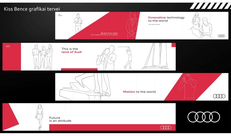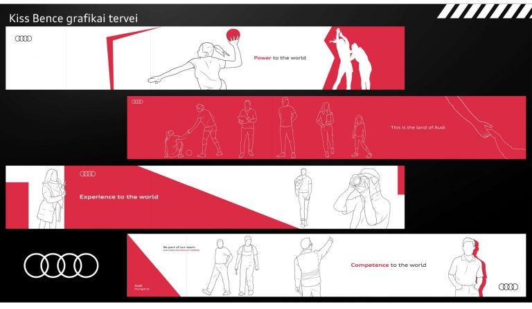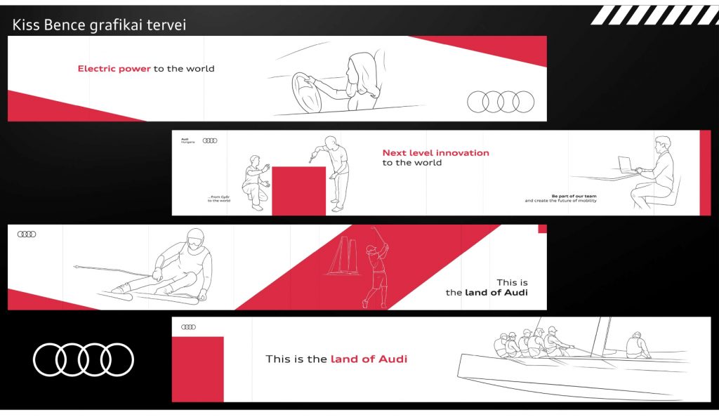 A győztes pályamű alkotója, a széchenyis Kiss Bence az ember felül közelítette meg a kérdést. A stílus – hogy fényképekből készít vektoros grafikát – már megvolt a fejében, a gyárlátogatás után pedig már azt is tudta, hogy emberábrázolással fejezi ki, mennyi ember dolgozik Győrben azért, hogy aztán emberek elégedetten használhassák Audijukat, illetve a képek által a márka sportszponzorációira is utalhat.