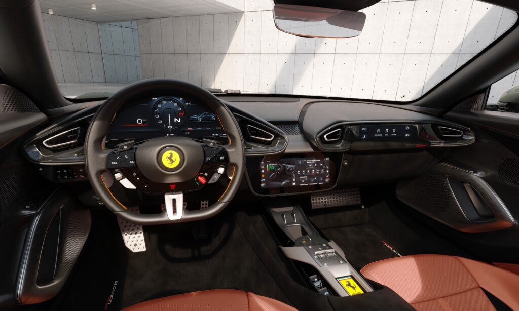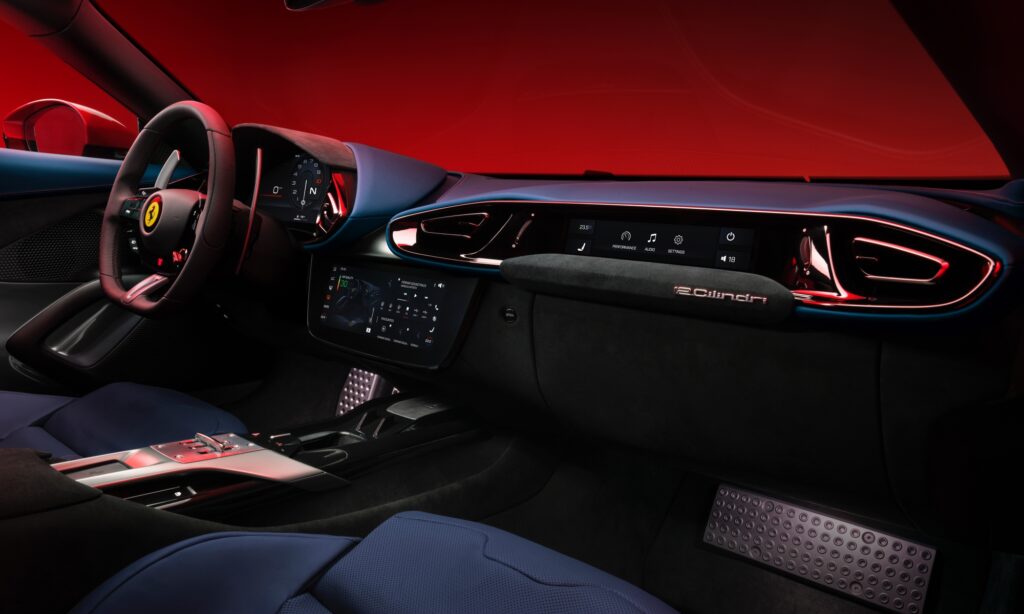 Kétféle ülés közül választhatnak a 12Cilindri vásárlói, melyek közül az egyik a komfortosabb, a másik pedig egy karbonvázas kagylóülés, hogy versenypályán is tökéletes legyen a Ferrari vezetési élménye. Hagyományos műszerek nincsenek, a vezető előtt egy 15,6 colos kijelzőn jelenik meg az óracsoport, a központi érintőképernyő 10,25 colos, az utas szellőzők közé integrált kijelzője pedig 8,8 colos.