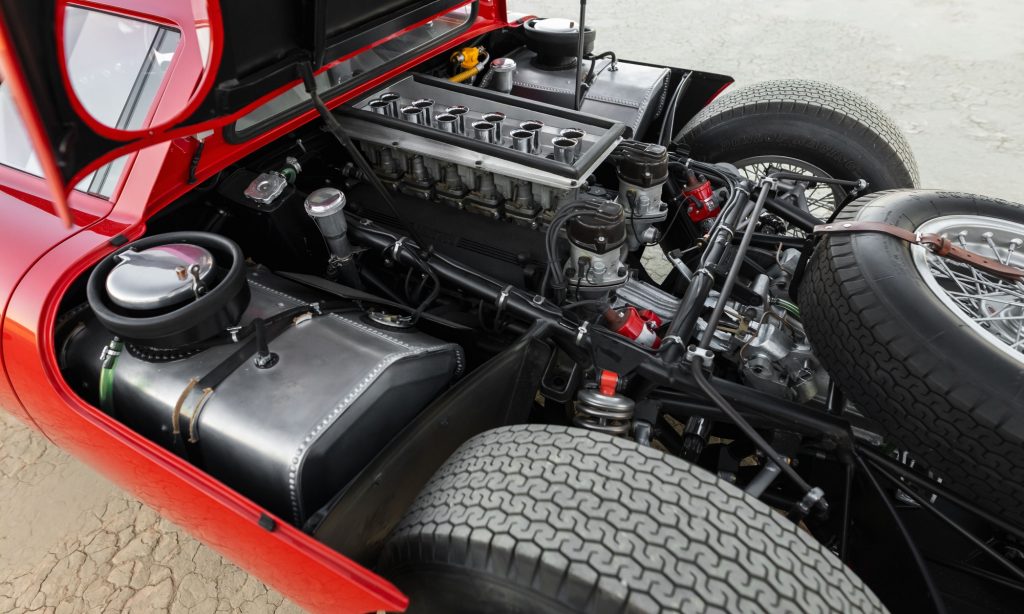Érdekes a gépháztető, amivel együtt szinte az autó teljes hátulja felnyílik. és láthatóvá válik a tizenkét hengeres motor. Kétoldalt nagyméretű légbeömlők vannak rajta, hátul pedig sűrű rácsozáson keresztül húzza ki a nyomáskülönbség a motor pusztító hőjét. A tetején lévő vastag oszlopnak csak esztétikai és aerodinamikai szerepe van. Hátulról betekintve olyan, mintha egy alagút végén volna a kétfős kabin.