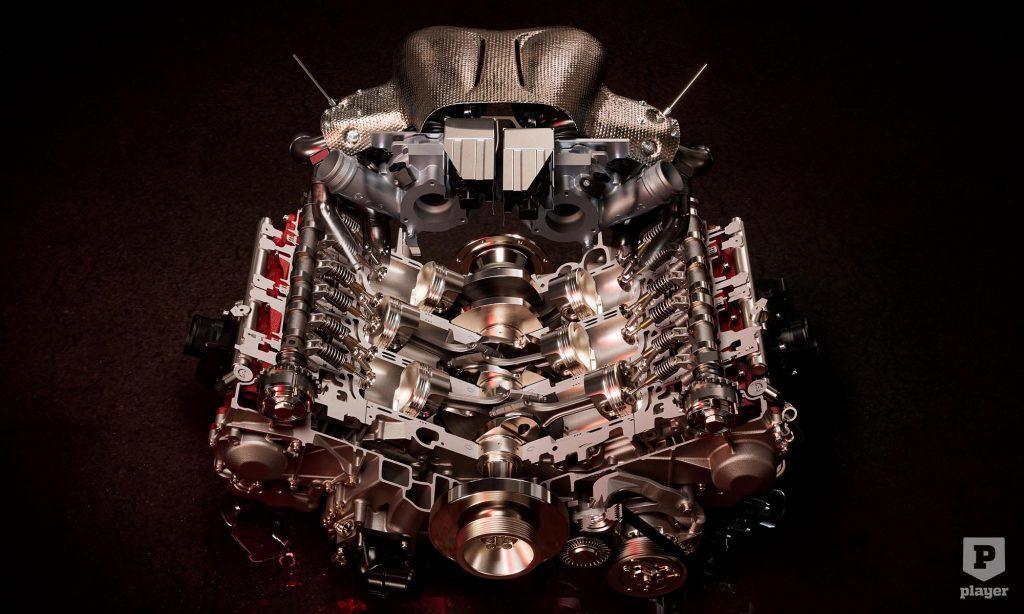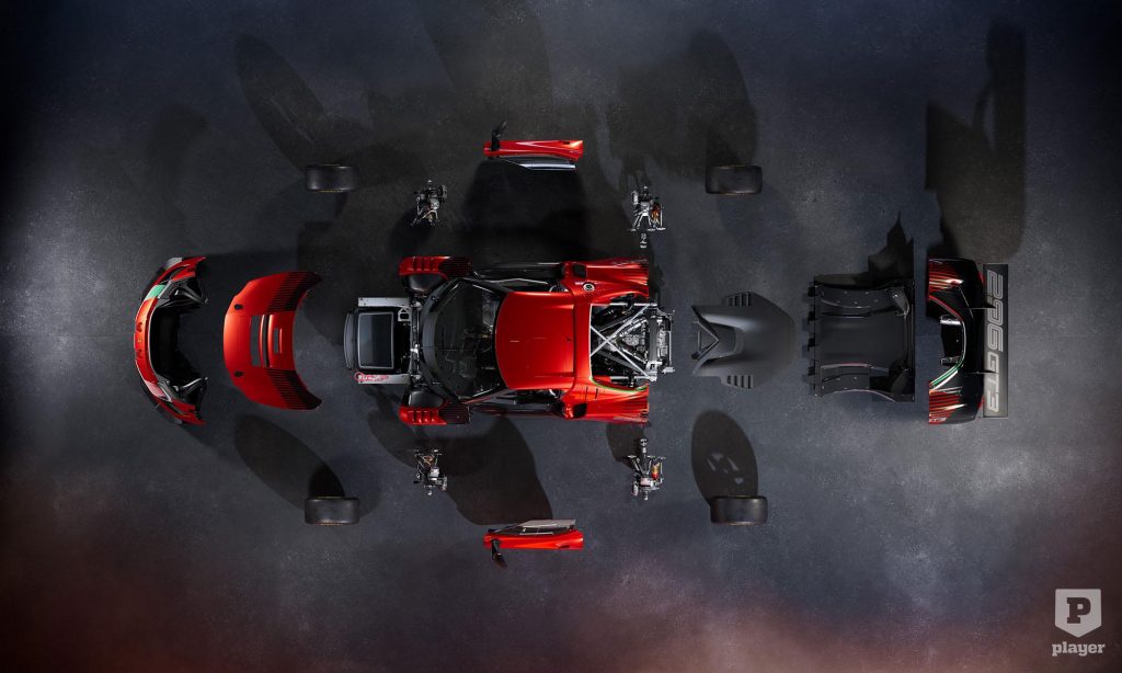 Az utcai autó hibrid rendszerének azonban a GT3-as szabályok miatt búcsút kellett inteni, ezért a 2992 köbcentis biturbó V6-ossal szerelt autó teljesítménye 830-ról 600 lóerőre, a maximum nyomatéka 730-ról 710 newtonméterre csökkent.