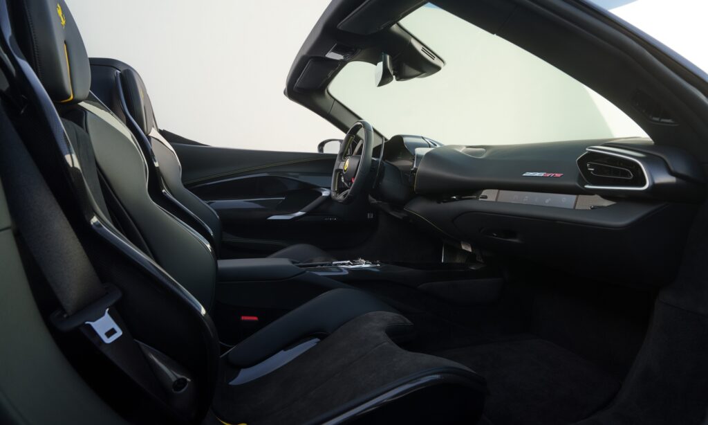 Sokkal látványosabb azonban a 296-os lágy vonalait megtörő szélesítés, mellyel elöl 6, hátul pedig 12 centiméterrel lesz szélesebb a karosszéria. A Vittorio Strosek által tervezett szénszálas elemek határozott élei egészen megváltoztatják a középmotoros Ferrari megjelenését, és nem biztos, hogy előnyére.