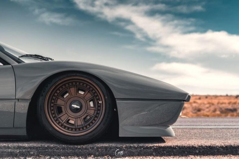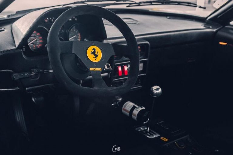 A szürke fényezés sem korabeli, ahogyan a légrugós felfüggesztés sem, de ha már az aszfaltig lehet ültetni a Ferrarit, akkor nagyszerűen illenek hozzá a Rotiform könnyűfém kerekek. A karosszéria szélesítését kevlár és szénszálas anyagból készítik el.