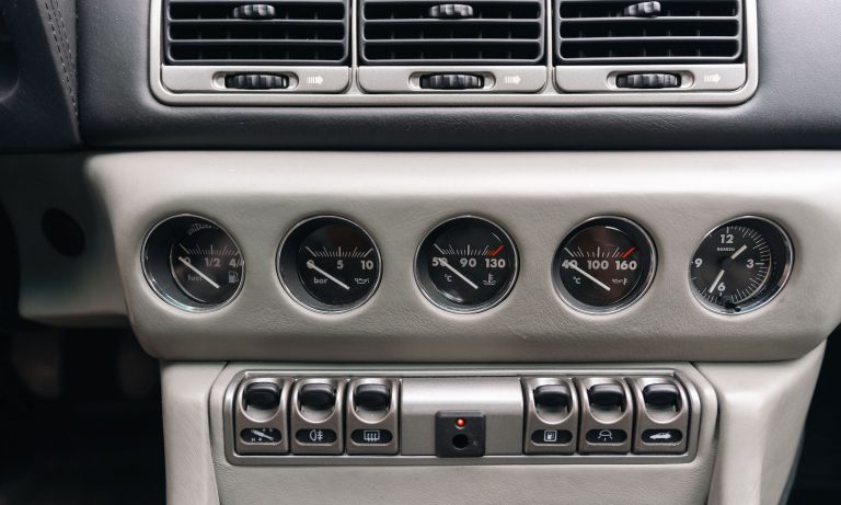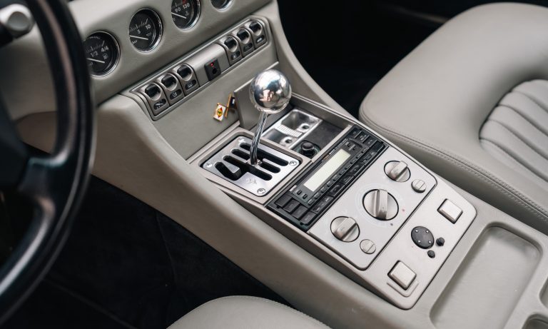 Már lehetett automata váltóval is kapni, de a három pedállal, a hatfokozatú kézi váltóval az igazi. Középen ott a nyitott kulissza, melybe vékonyka fém pálcát szúrtak, a rideg gombja bőrkesztyűs kezet kíván. Felette ott sorakoznak a kiegészítő műszerek, mert egy autóban a sebességen és a fordulatszámon túl illik figyelni többek között az olajnyomásra és az olajhőmérsékletre is. A rádiót és a klímakonzolt a könyöklő elé tették, mert kéz alatt kell lennie, de valójában lényegtelen mind.