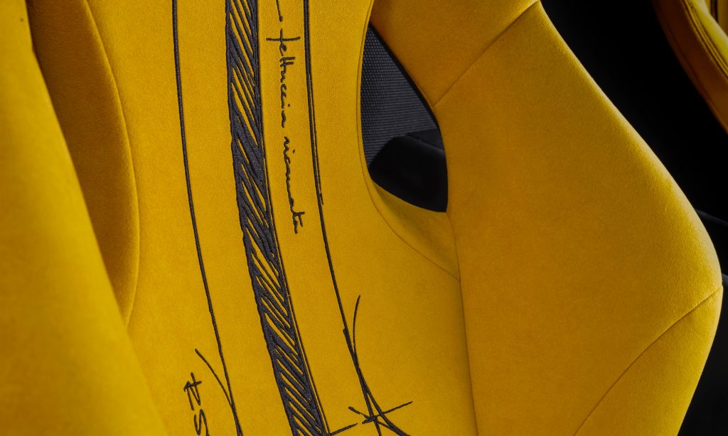 Fényezéséhez tökéletesen passzoló sárga Alcantara kárpitozása már sokkal igényesebb munka, mint a matricázott karosszéria. Az anyagba hímezett tollvonások és megjegyzések izgalmassá teszik a sportautó utasterét, amiben a főszerep nem egy központi kijelzőé, hanem a kormányé és a sportüléseké. A fém pedálsor és a hatalmas váltófülek megüzenik, hogy a 812-ben a vezetés a lényeg, nem a színház.
