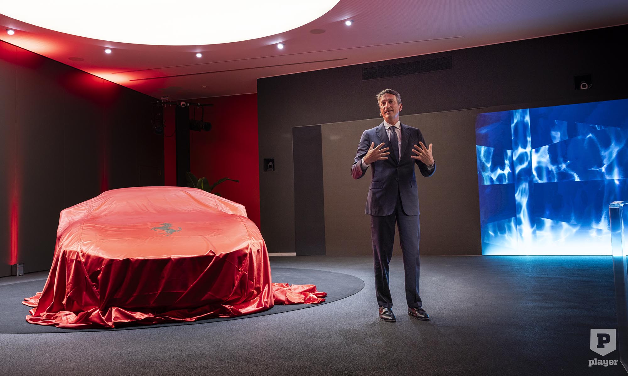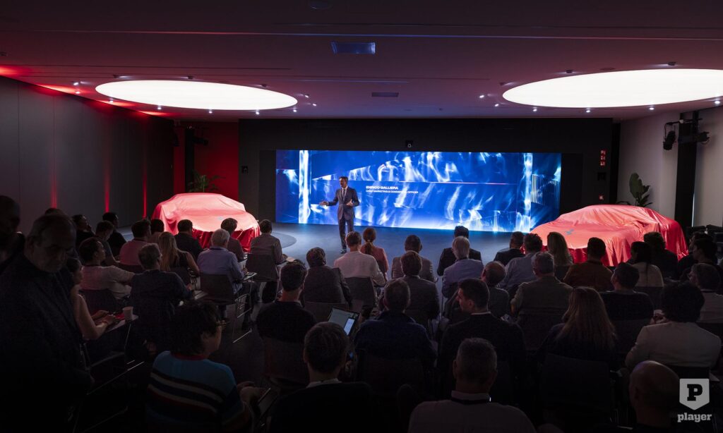Beterelnek minket a gyár egyik épületébe, ahogy említettem, a kamerákat azonnal leragasztják, pedig ott állt a recepción egy F80. Mindent a szemnek, semmit a fényképezőgépnek. Irány fel a másodikra, majd egy kis felkészülési kávészünetet követően a nagyjából 140 fős közönséget egy ablak nélküli terembe küldik, ahol két oldalon a Ferrari pompás piros színű leplével elbújtatott, gyanúsan autóra hajazó formák várnak ránk. Beültünk a második sorba, az elsőben már nem volt hely, de innen is jól láttunk.