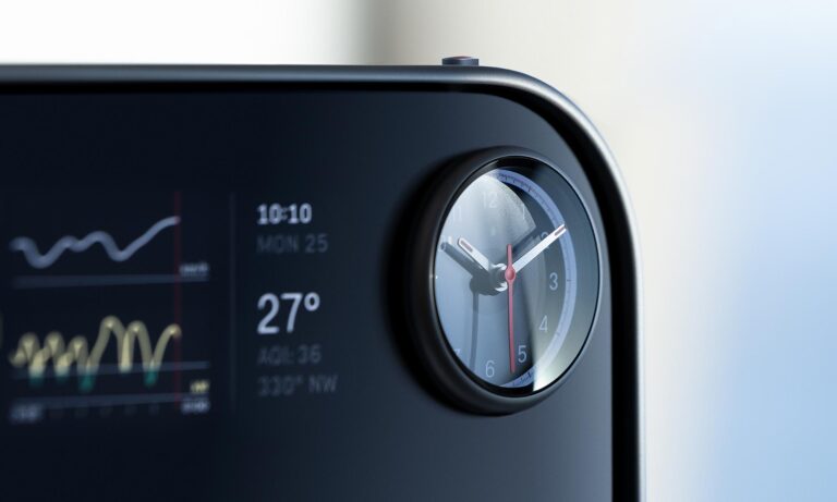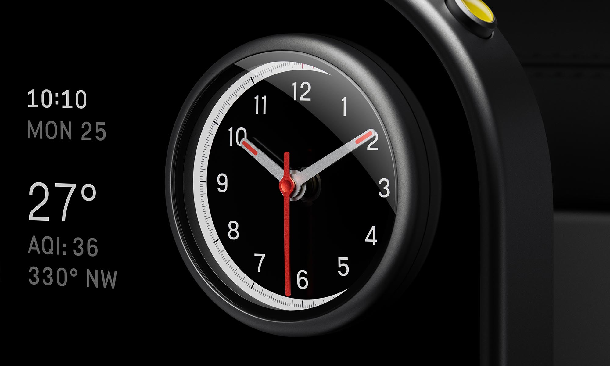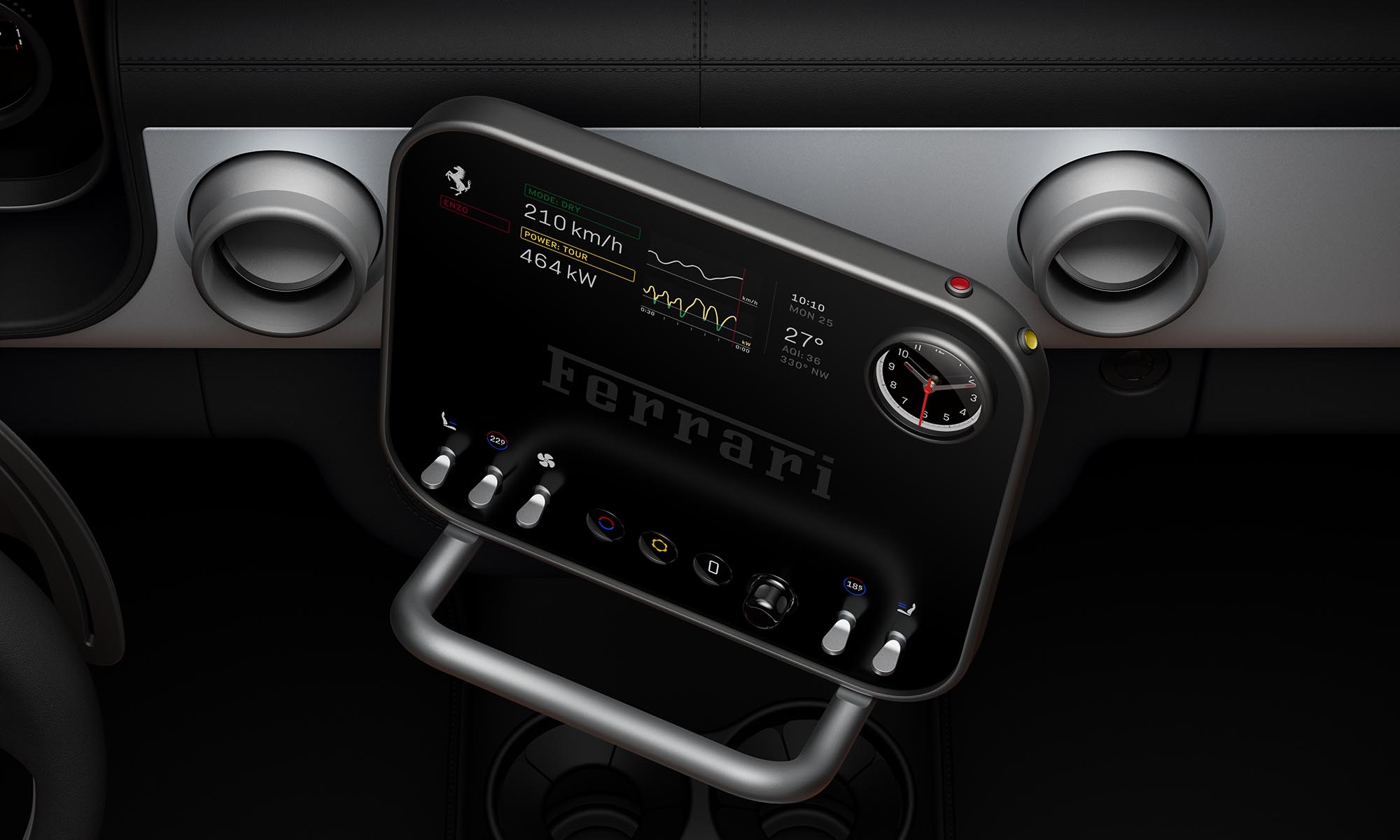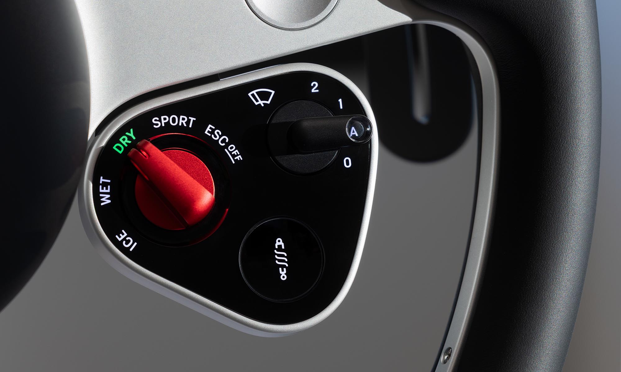 Még különlegesebb órát találsz a központi kijelzőbe építve: ez egy mechanikus óra, három különálló mutatóval. A háttere egy testreszabható digitális kijelző, ami négy funkciót kínál: óra, kronográf, iránytű és rajtautomatika. Amikor módot váltasz az okosórát idéző gombokkal, akkor a mutatók látványos mozdulatokkal rendeződnek át az új feladathoz. Maga a központi kijelző a vezető vagy az utas felé fordítható, és hagyományos, fizikai gombok vannak rajta.