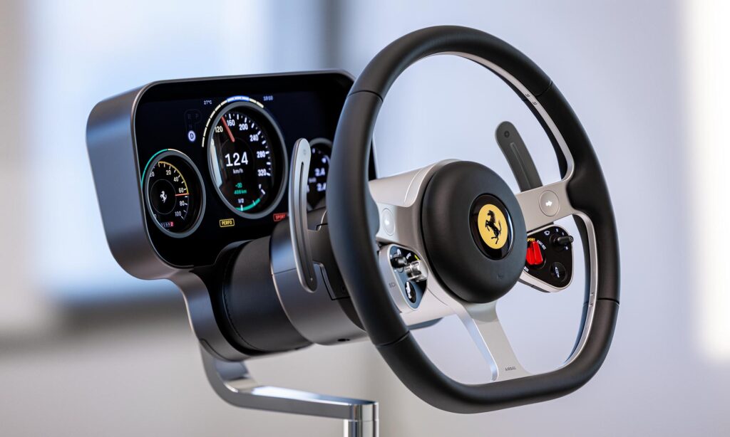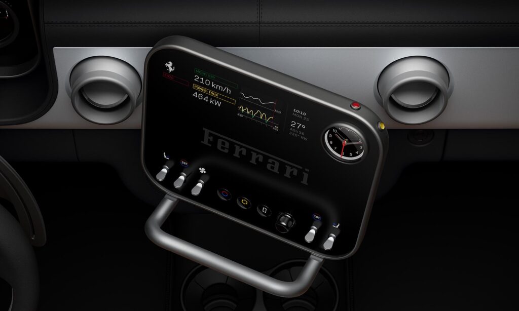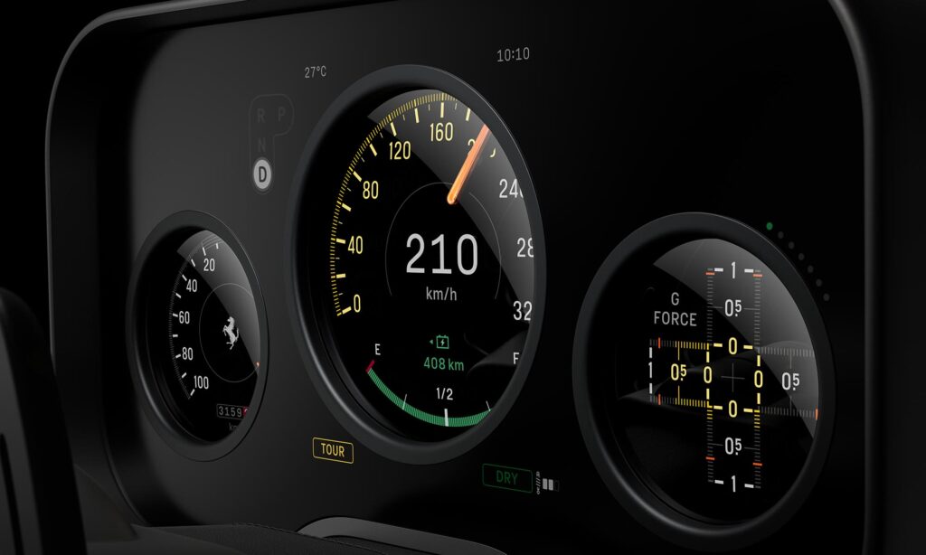 A műszerfalához foghatót eddig még nem láthattál más autóban. A két, egymásra helyezett OLED kijelző közül a felső panelen három kerek kivágás található, amelyen keresztül az alsó kijelző adatai látszanak, és ahol a valódi, alumíniumból készült mutató is mozog. A Ferrari ezzel megalkotta az analóg és digitális műszerfalak tökéletesnek tűnő keverékét, amelynek dizájnja az ötvenes-hatvanas évek óráit idézi, és sokkal könnyebben leolvasható a modern digitális műszerfalaknál.