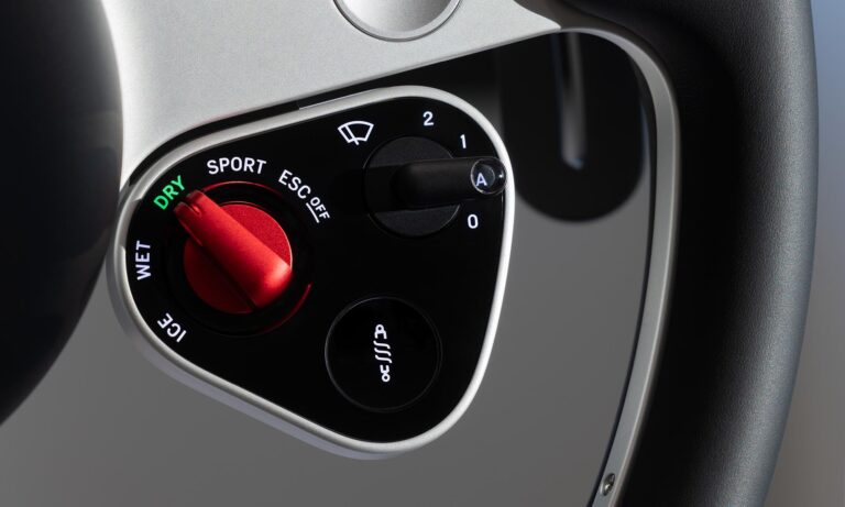 Ami az autóban nem fém, az üveg, de nem egyszerű ablaküveg, hanem a Corning speciális üvegét használták, amit extrém körülményekre fejlesztettek ki: vékony, karcálló, és a törésteszteken is átment. Ez az anyag köszön vissza az ablakemelőktől kezdve a központi kijelzőbe süllyesztett gombokon át egészen az irányváltó tárcsáig. Még a sebességváltó gombját is belülről, lézerrel színezték, hogy elérjék a különleges, áttetsző hatást.