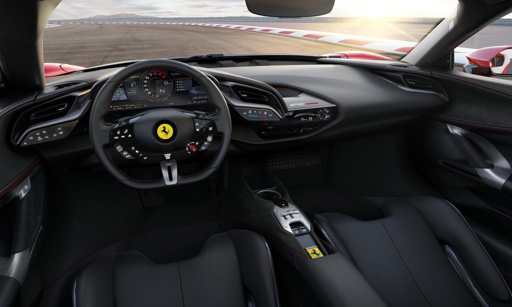 Az utastérrel óriásit lépett előre a Ferrari, a kormánykerék mögött 16 colos hajlított kijelző mutatja a műszereket,