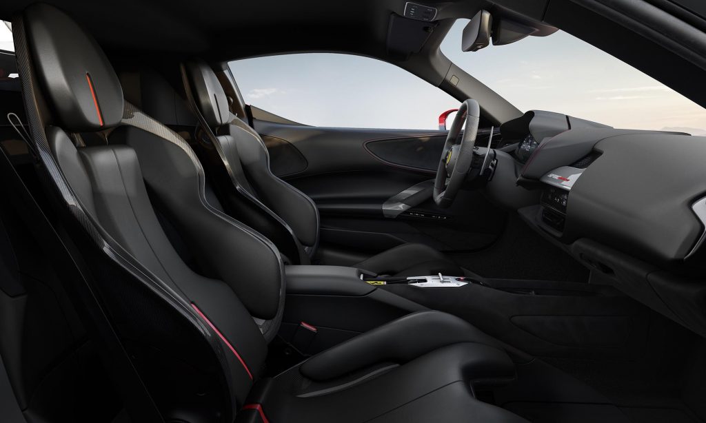 A 4,71 méter hosszú, 1,97 méter széles és 1,19 méter magas SF90 Stradale arányai inkább az F8 Tributót juttatják eszünkbe, pedig a nagy része egyedi, a kabinját is előbbre tolták.
