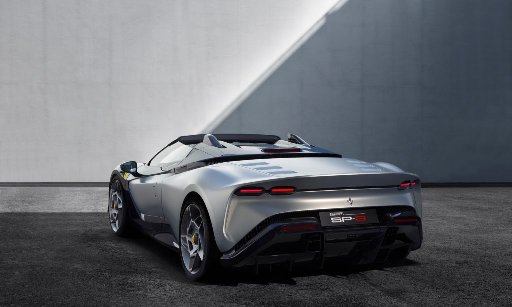 Nem esztétikai, hanem műszaki szempontok miatt hagytak egyre nagyobb helyet a lamellák között az autó széleihez közelítve, ezzel a megoldással tudják jól terelni a levegőt a hűtőkhöz. A Ferrari SP-8 az F8 Spider műszaki alapjaira épül, de megköveteli a tökéletes időjárást, mert nincsen teteje. Hátsó lámpái a Romáról származnak, a kipufogócsövek pedig a 296 GTB-t idézik, a felniket az F40-es kerekei alapján tervezték kifejezetten az SP-8-hoz. Kétszínű karosszériáján a Blu Scuro Stellato és a matt Argento Micalizzato szín fűződik össze, melyet kékre színezett szénszálas elemek egészítenek ki.