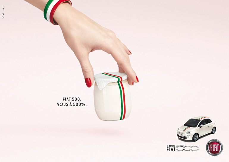 A Fiat kisautó-kínálatából a Panda a racionális döntés, aki inkább a drágább 500-ast választja, ki akar fejezni valamit a külvilágnak. Ebben segít a választható kiegészítők tengere, melyekkel pillanatok alatt személyre szabható a gömbölyded retromobil. Ezt az egyediséget hangsúlyozza a párizsi Leo Burnett reklámügynökség legújabb kampánya, mely az "500%-ig Ön!" szlogennel tereli a franciákat a legközelebbi Fiat-szalon felé: