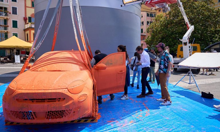 „A Fiat célja, hogy színt és optimizmust vigyen egy olyan világba, amelynek nagyon is szüksége van rá” – az olasz autómárka ezzel vezette fel legújabb videóját, amelyben Olivier Francois, a Fiat vezére beszáll a hivatalosan még be sem mutatott 600-asba, amit aztán a liguriai Lerici főterén álló hatalmas festékes üstbe mártanak.