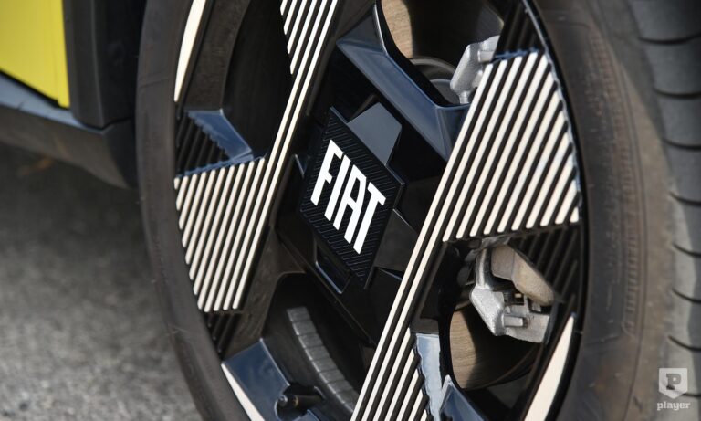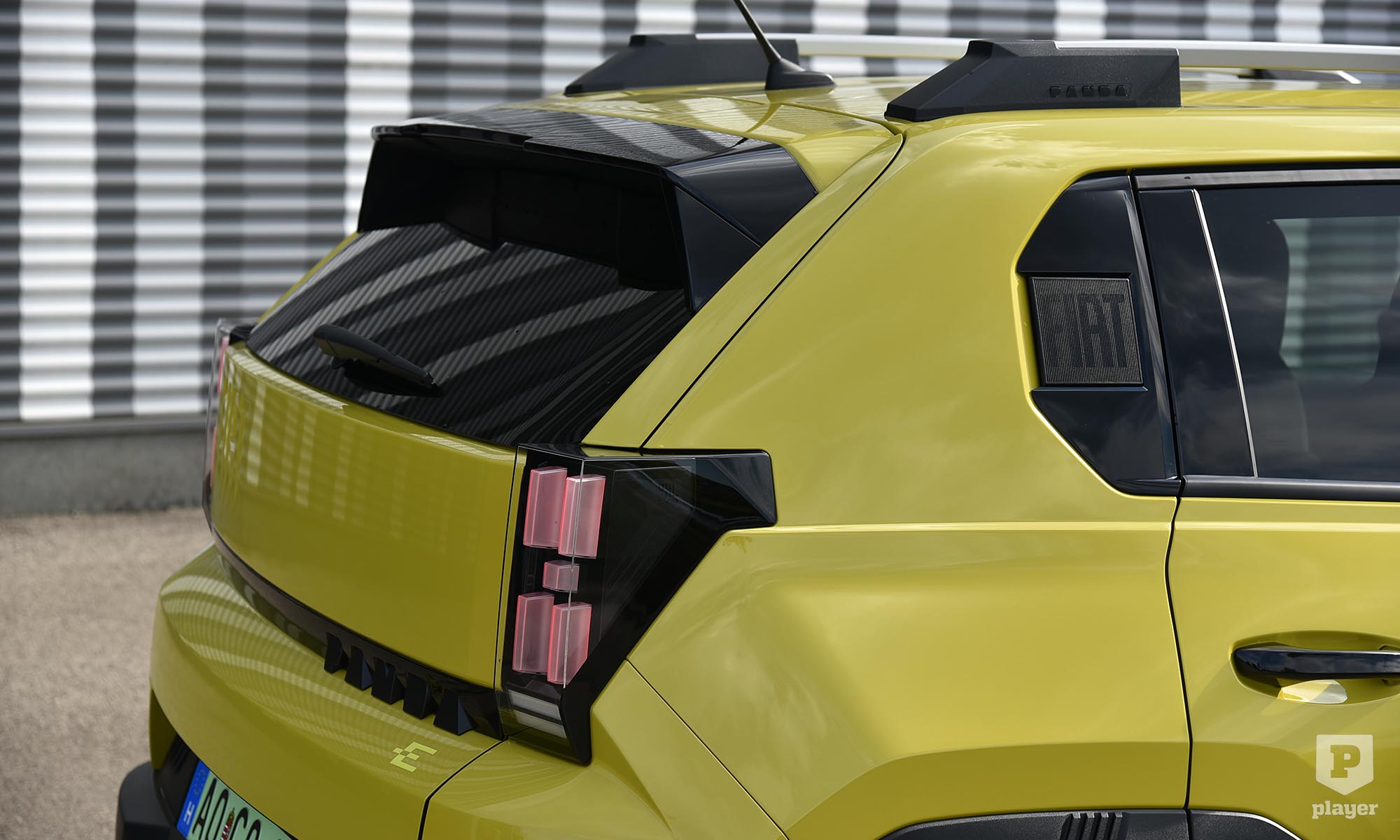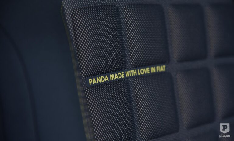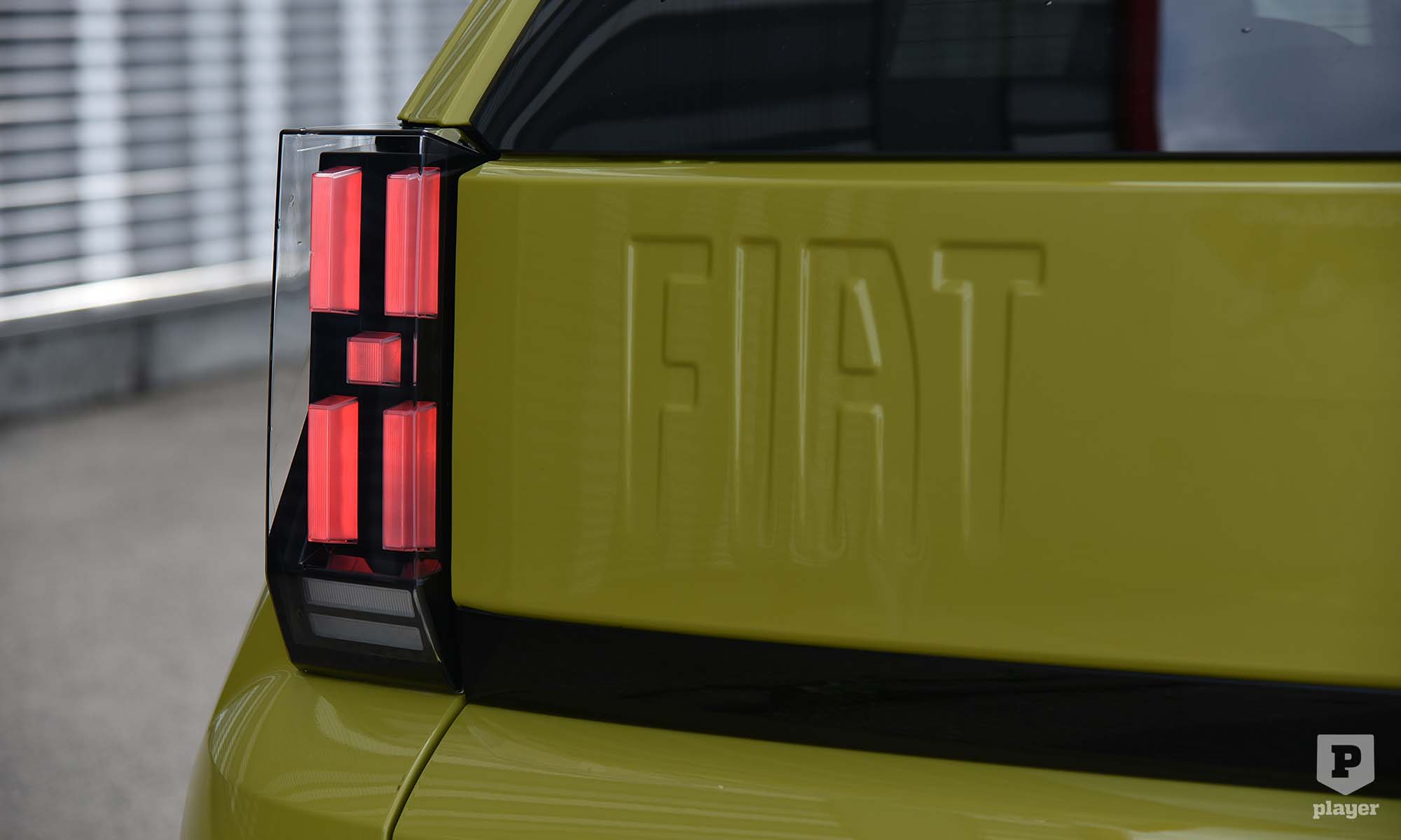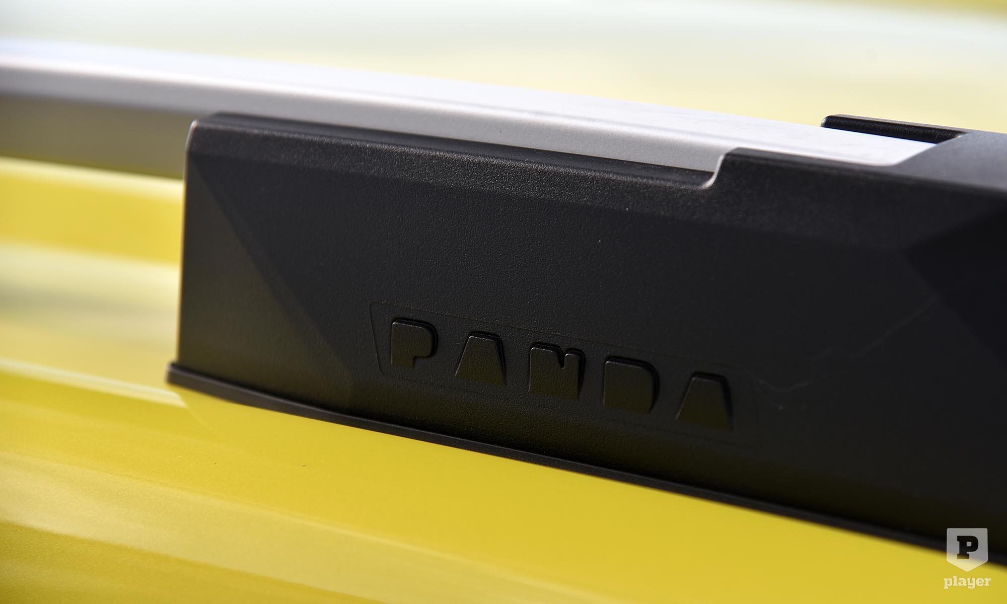 Karakteres Grande Panda-részlet még a lemezbe nyomott felirat, az oldalajtókban a PANDA, a csomagtérfedélen a FIAT olvasható, a szintén a csomagtérajtón látható, 3D-s PANDA betűkben pedig több a kreativitás, mint amennyi néha egy-egy teljes autókarosszériára jut. A feliratokon kívül is jellegzetes a magas far, a hátsó lámpában is ott van az X, a nagy felületet ügyesen osztják fel a fekete elemek, ez a kommunikációs színként is használt, a La Primánál alapáras sárga színnél remekül látszik. Múltidéző a C oszlop dekorációja is, de ez kivételesen nem az első Pandát, hanem iskoláskorom menő vonalzóit idézi, amelyek attól függően mutattak más képet, hogy honnan pillantottunk rá. Itt színek nincsenek, nézőpontot váltva FIAT felirat vagy fiatos ferde csíkok viszont vannak.