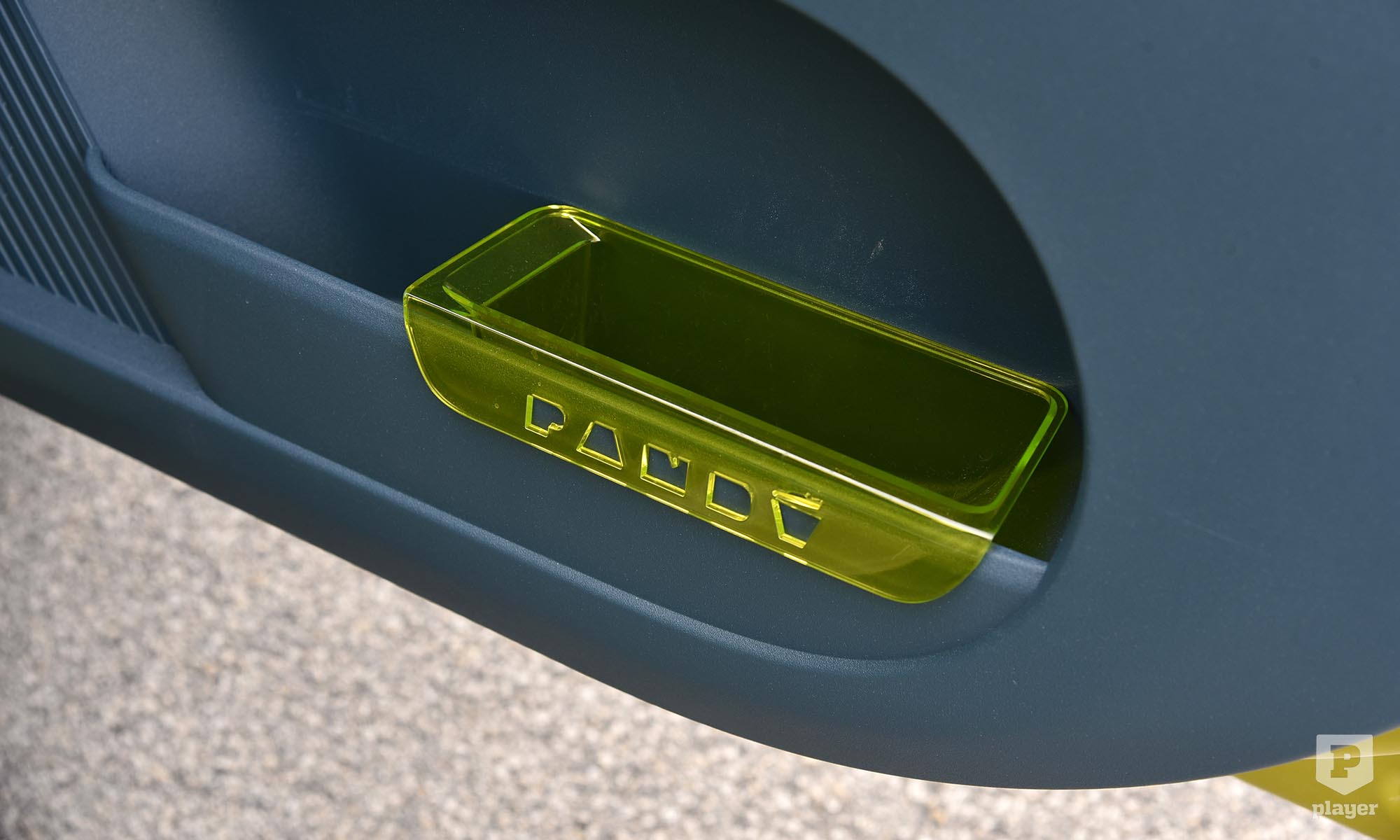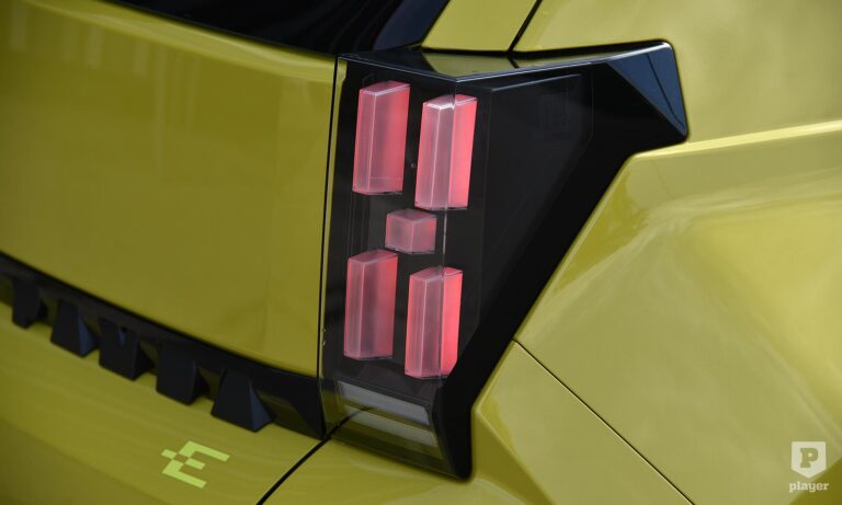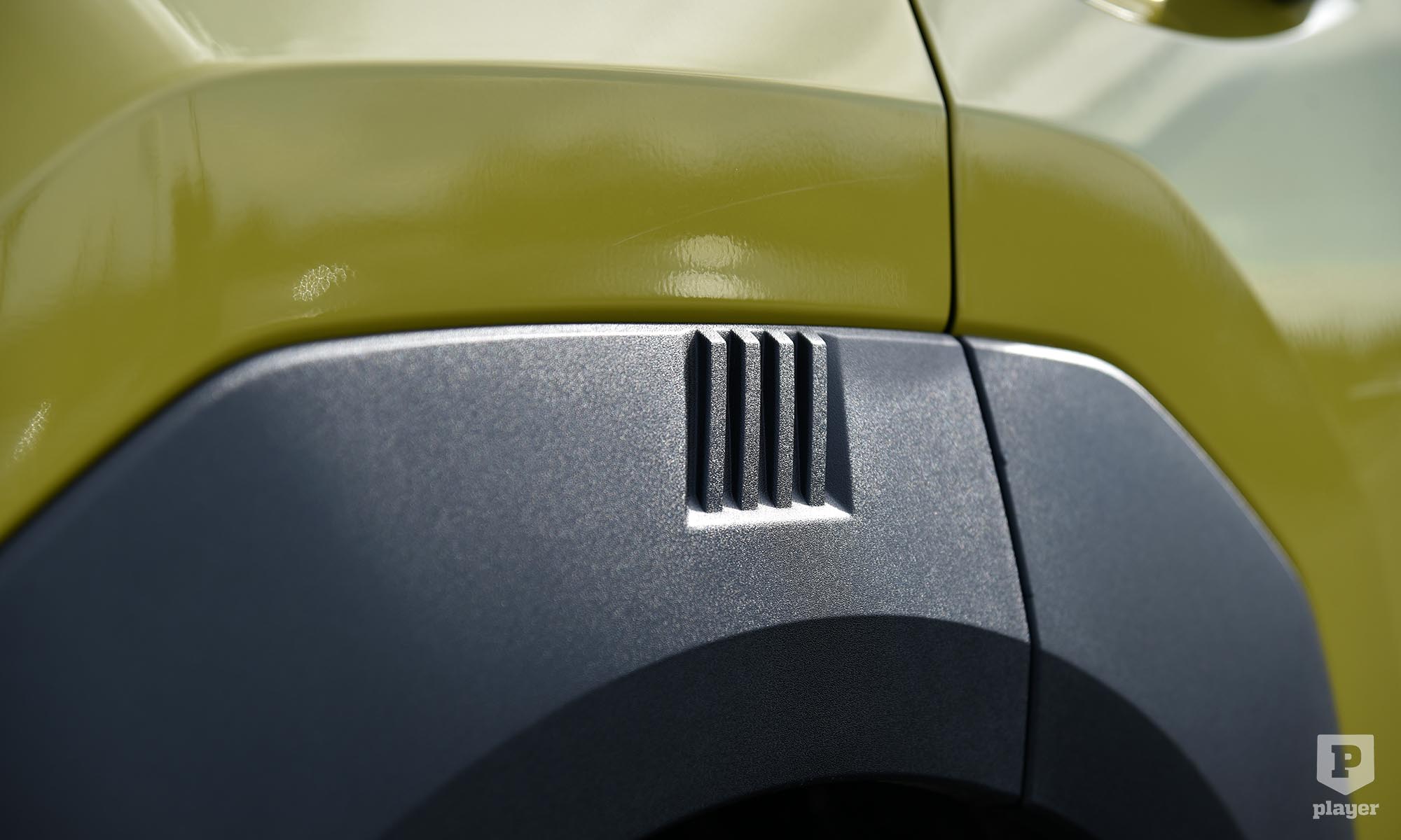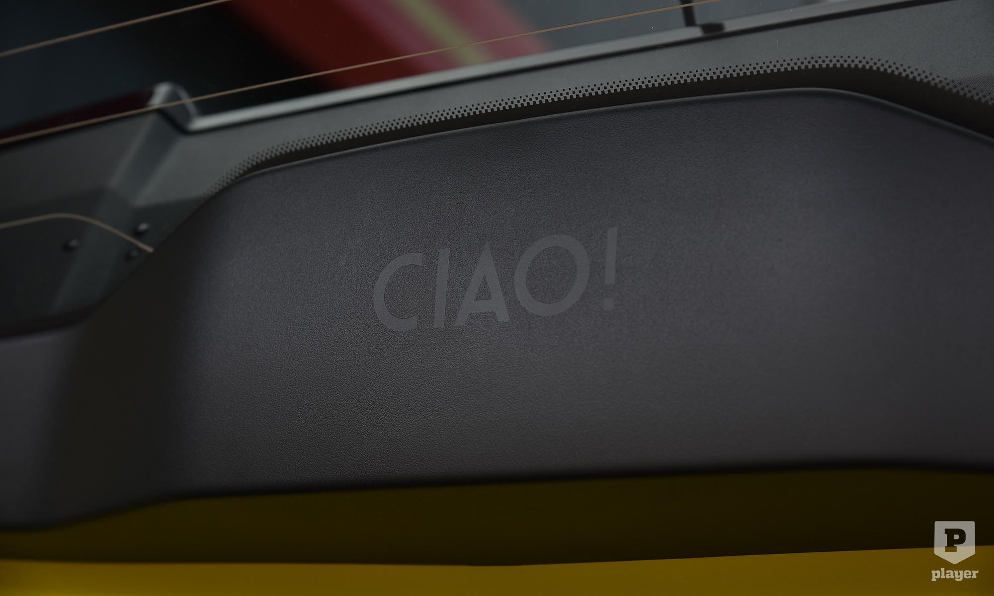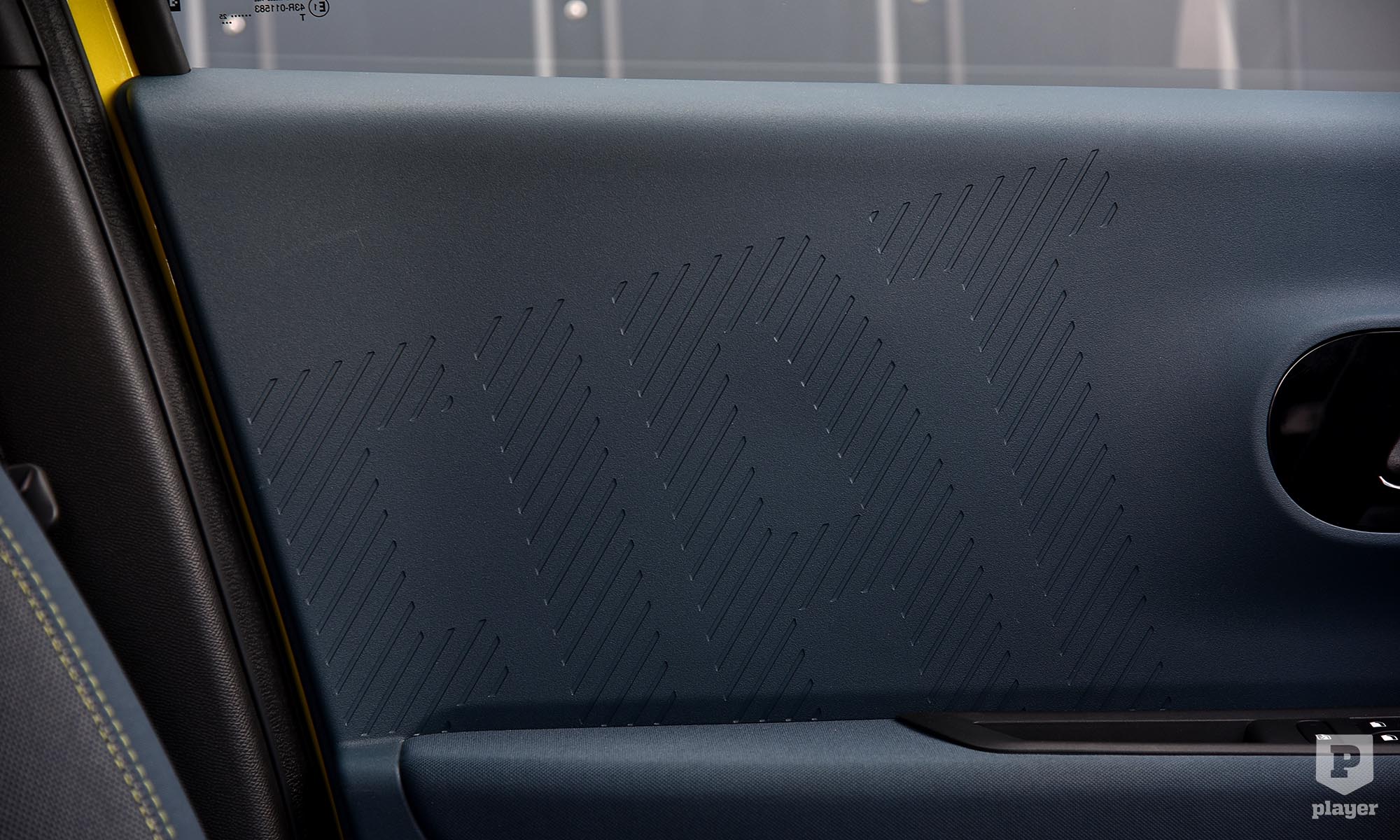 Karakteres Grande Panda-részlet még a lemezbe nyomott felirat, az oldalajtókban a PANDA, a csomagtérfedélen a FIAT olvasható, a szintén a csomagtérajtón látható, 3D-s PANDA betűkben pedig több a kreativitás, mint amennyi néha egy-egy teljes autókarosszériára jut. A feliratokon kívül is jellegzetes a magas far, a hátsó lámpában is ott van az X, a nagy felületet ügyesen osztják fel a fekete elemek, ez a kommunikációs színként is használt, a La Primánál alapáras sárga színnél remekül látszik. Múltidéző a C oszlop dekorációja is, de ez kivételesen nem az első Pandát, hanem iskoláskorom menő vonalzóit idézi, amelyek attól függően mutattak más képet, hogy honnan pillantottunk rá. Itt színek nincsenek, nézőpontot váltva FIAT felirat vagy fiatos ferde csíkok viszont vannak.