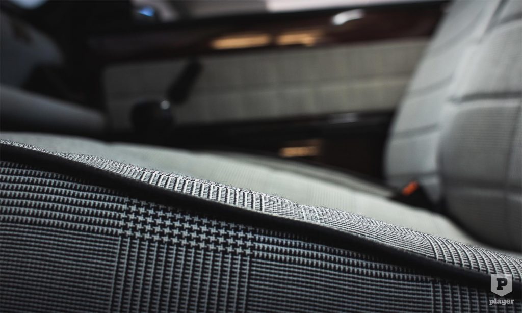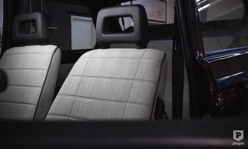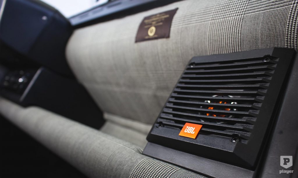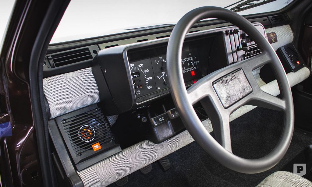A kockás kárpitok nagyon illenek a kisautó stílusához, a korabeli slágereket a hozzá szabott JBL hifin lehet hallgatni.