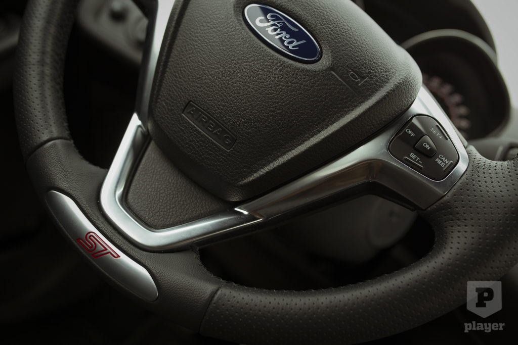 Kellemes, sportos méretű, bőrrel bevont kormánya erős markot követel, nem érdemes félkézzel lazáskodni. Igaz, nem "ablakon kikönyöklős" időben próbáltuk ki, de valami azt súgja, abból hamar meglenne a baj. Mindhiába érkezel határozott és megfontolt lassúsággal a kereszteződésbe, amikor felvillan a zöld lámpa, akkor letaposod a gázt és 10 másodperc múlva már megint az élen gurulsz. Éppen emiatt az elfojthatatlan kísértés miatt eszelték ki a Ford biztonságért felelős szakemberei a MyKey pótkulcs rendszert, ami egyfajta szülői kontroll, sebességkorlátozással, vagy épp a kipörgésgátló kiiktatását blokkolva akadályozhatja meg, hogy a friss jogsival menőző kölkök telibe verjék apu játékszerét, ha elugranak szombaton a zöldségeshez.