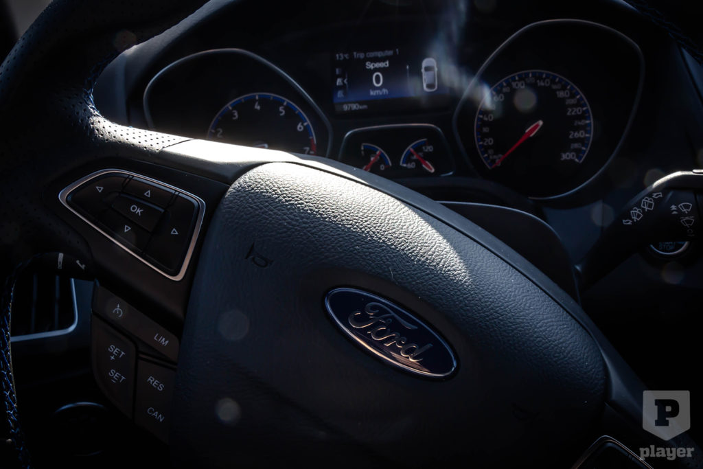 A műfajából adódóan az autóban is megvan ez a furcsa kettősség: kőkemény sportülés oldaltámaszán kell átmászni ahhoz, hogy a Focus kicsit már öreg műszerfala előtt foglalhassunk helyet. Némi különbség azért akad: a sebességmérő 300-ig skálázott, középen, legfelül pedig az olajhőmérséklet, turbó- és olajnyomás műszere van. A kormányon a kék cérna jelenti a sportosságot, amit akár egy csillámpóniszőrrel varrottra is azonnal elcserélnénk, ha kisebb lenne az átmérője.