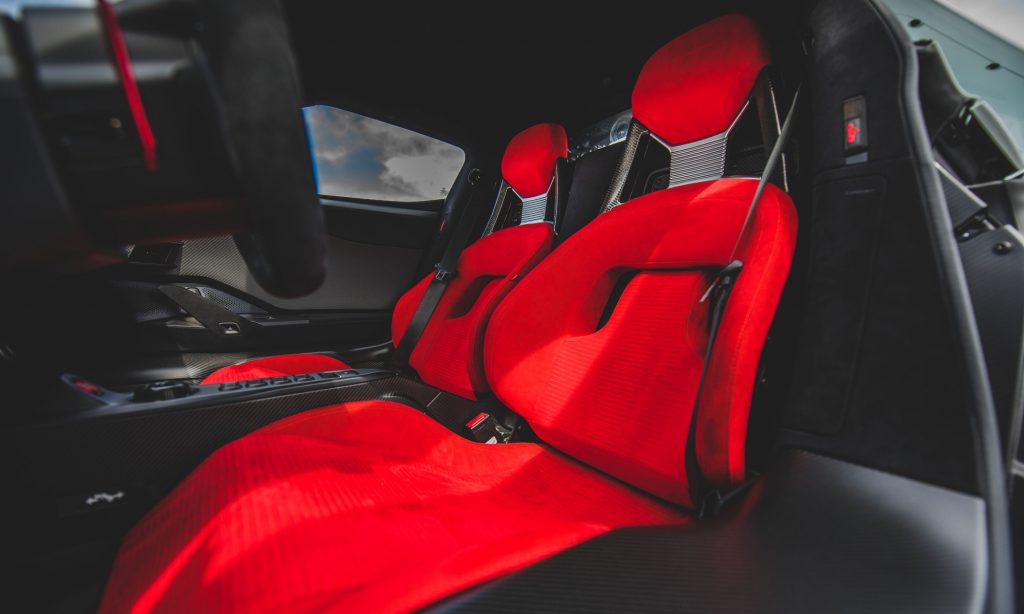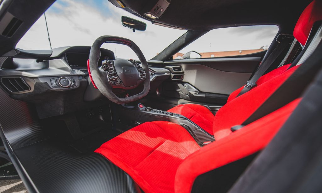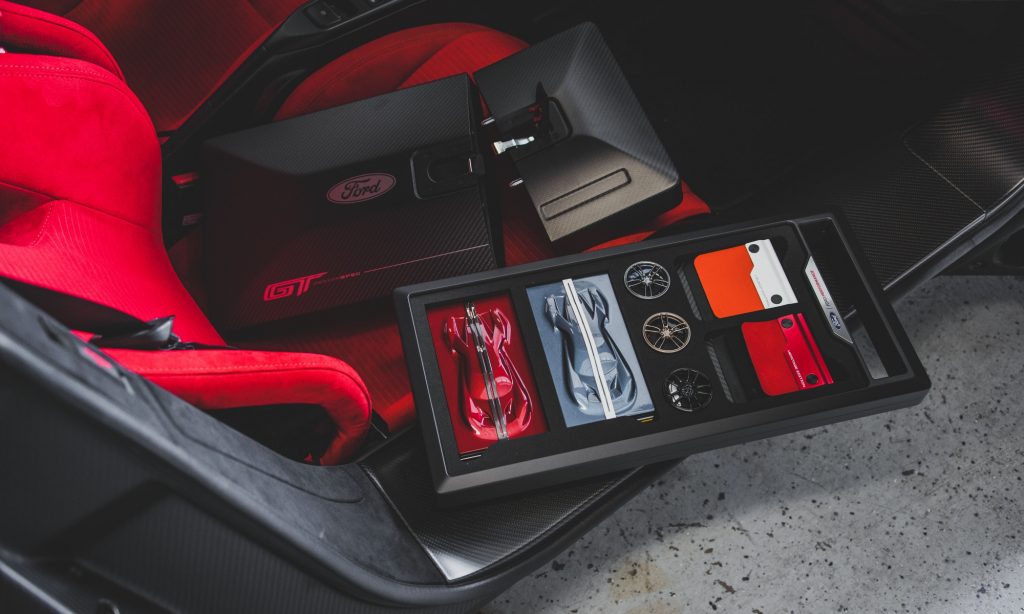 Mindenki egy színmintákkal és kárpitokkal tömött szénszálas dobozt kapott, aki maga állította össze a Ford GT-jét. Ez a látványos rendelési csomag ehhez az autóhoz is megvan még, melyből a piros féknyergek, karbon tükörházak és az élénk piros alcantara kárpitozású sportülések egészítik ki a hagyománytisztelő GT-t.