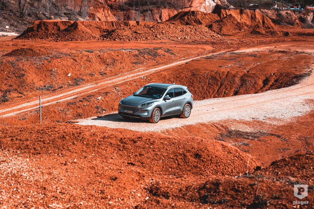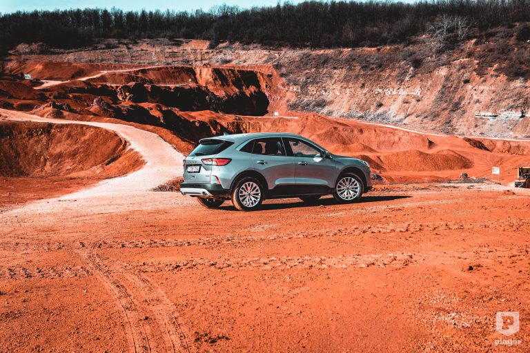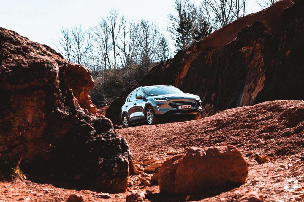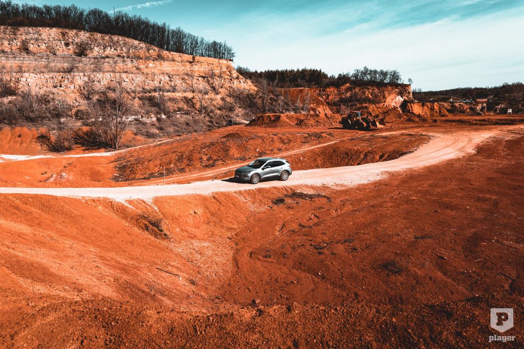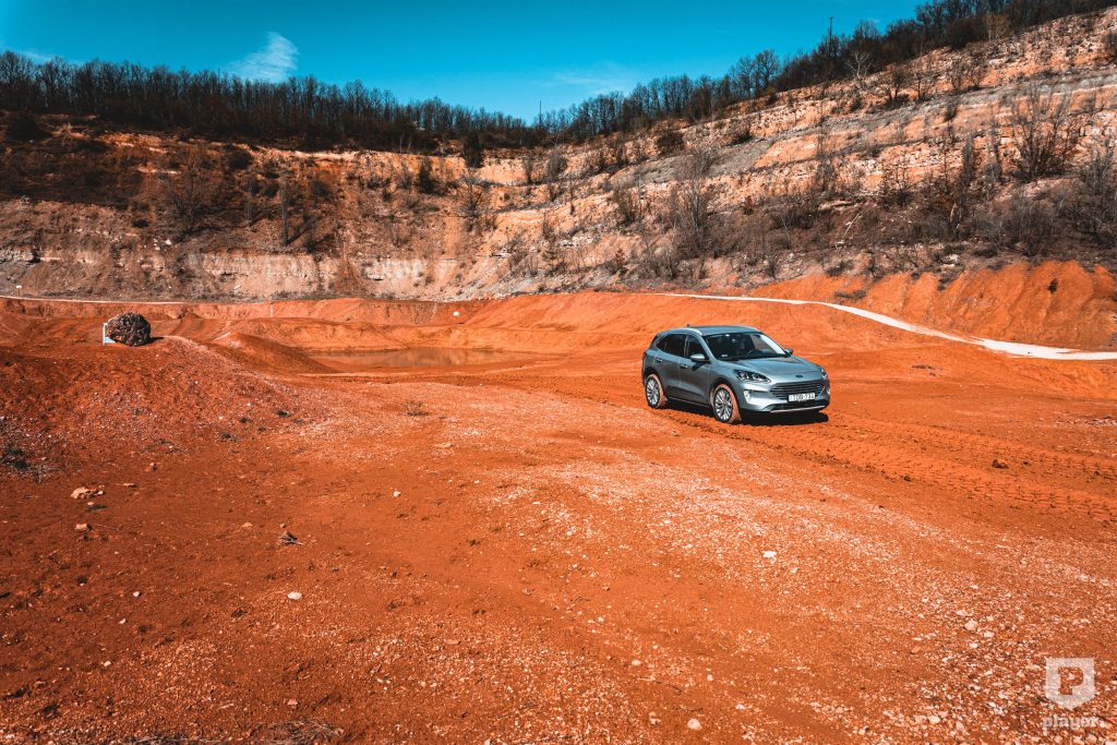 Adott az 1,1 kilowattórás kapacitású akkumulátor és egy 2,5 literes benzinmotor, azaz a 190 lóerő összesített rendszerteljesítményű Kuga, másfelől meg a durván 28 méter magas bányafal, és a dolomit alapkőzet sárgás-vöröses, olykor lilás árnyalatai. Marsbéli táj a Vértes-fennsík bércei közt,