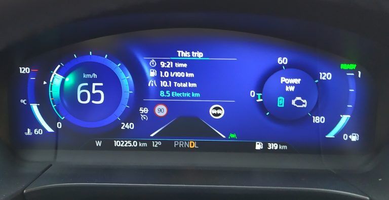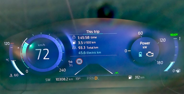 Donovaly magaslatairól lefelé száguldva az első 10,1 kilométerből 8,5-öt elektromosan mentünk, ami kerek 1 literes átlagfogyasztást jelent 100 km-en. Ez egy extrém példa, éppen ezért még elképesztőbb, hogy ugyanezen út első 93,3 km-éből 45,6 lett elektromos táv, 3,5 literes átlagfogyasztással.