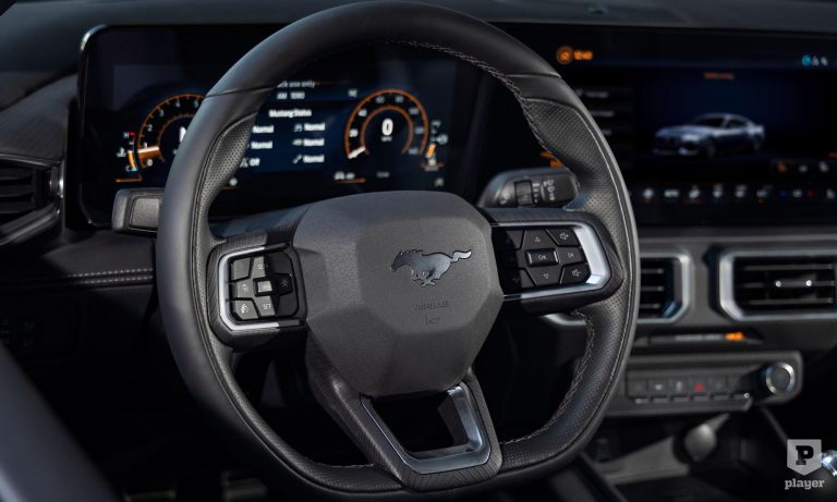 A vágtázó paripás kormánykerék mögött a műszerfal is teljesen megújult, sok más autóhoz hasonlóan itt is átvette az uralmat a dupla képernyő. A számlapokat 12,4 colos kijelző mutatja, minden mást pedig a közös üveglap alá került 13,2 colos érintőképernyőről lehet kezelni. Az opciók közt ott a Bang & Olufsen hifi, és
