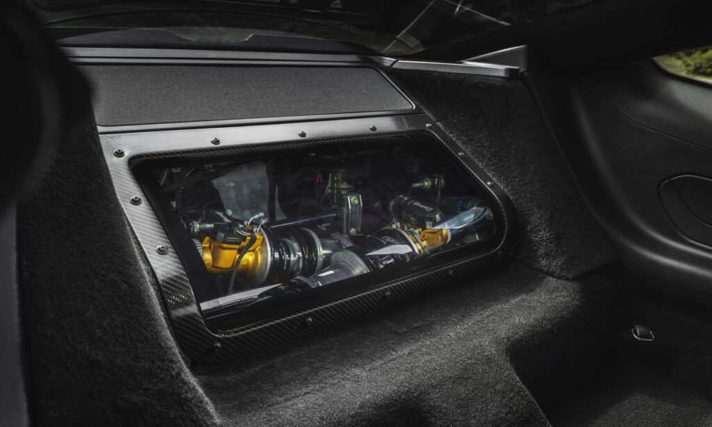 Mivel a lejtős fastback tetővonal miatt a kétajtós kupé hátsó ülésein egyébként sincs sok hely, ezért nem is akkora veszteség ezeknek a hiánya. Helyette viszont egy átlátszó panelen keresztül lehet nézni a nyomórudas futómű rugóstagjait. Mögötte pedig ott a nyolcfokozatú duplakuplungos automata váltó, mert a tökéletes súlyelosztáshoz elengedhetetlen volt a transaxle elrendezés.