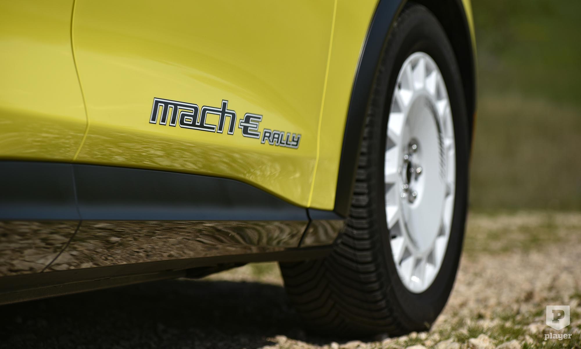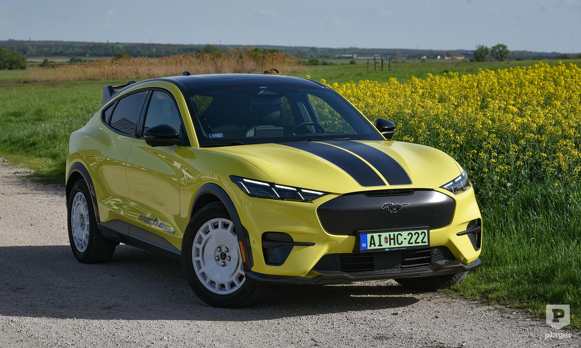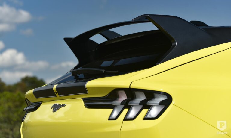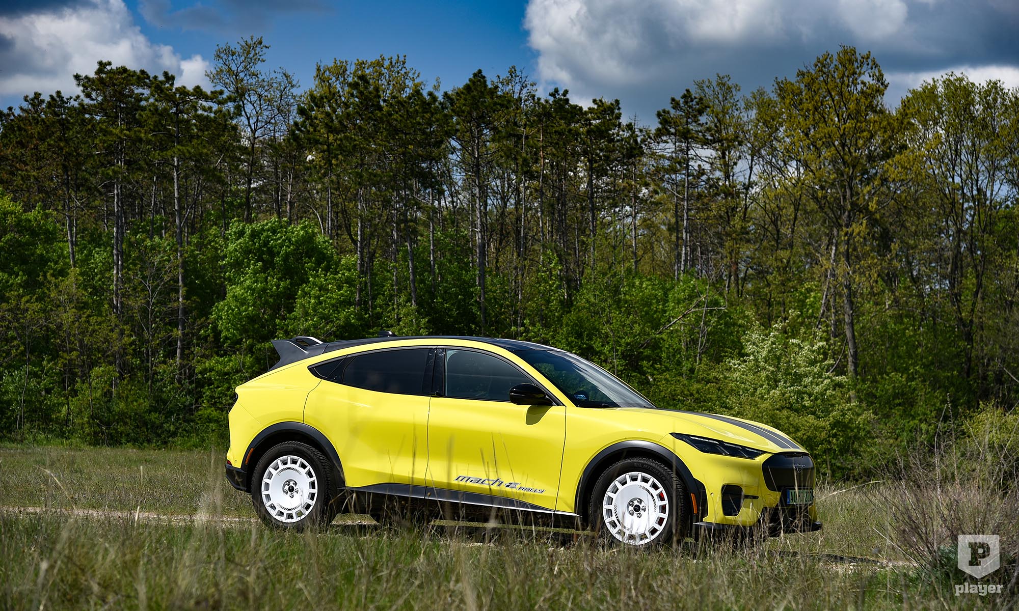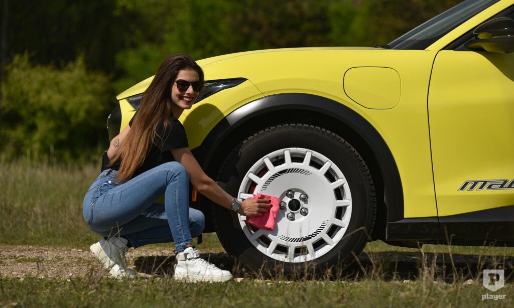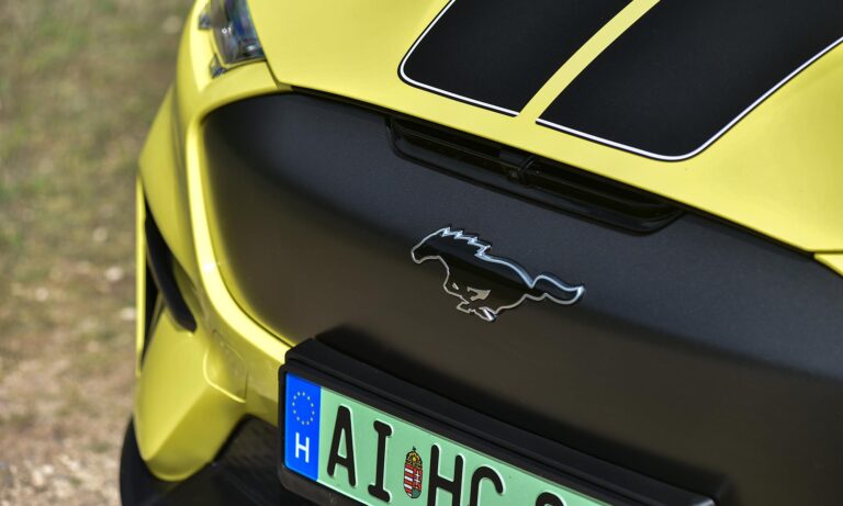 Becsületükre legyen mondva, amit lehetett, azt megtették a Fordnál, hogy ralis stílusjegyekkel dobják fel az elektromos Mustangot. A legfeltűnőbbek a murvás pályára szánt versenyautó-kerekekre hasonlító, fehérre fényezett teli felnik, amik annyira telik, hogy nem is látszik mögötte a Brembo féknyergek piros színe. A Focus RS ihlette a hatalmas hátsó szárnyat, és az egészet még feltűnőbbé teszi a gyorsítócsíkokkal ellátott Grabber sárga fényezés, ami ráadásul alapáron jár.