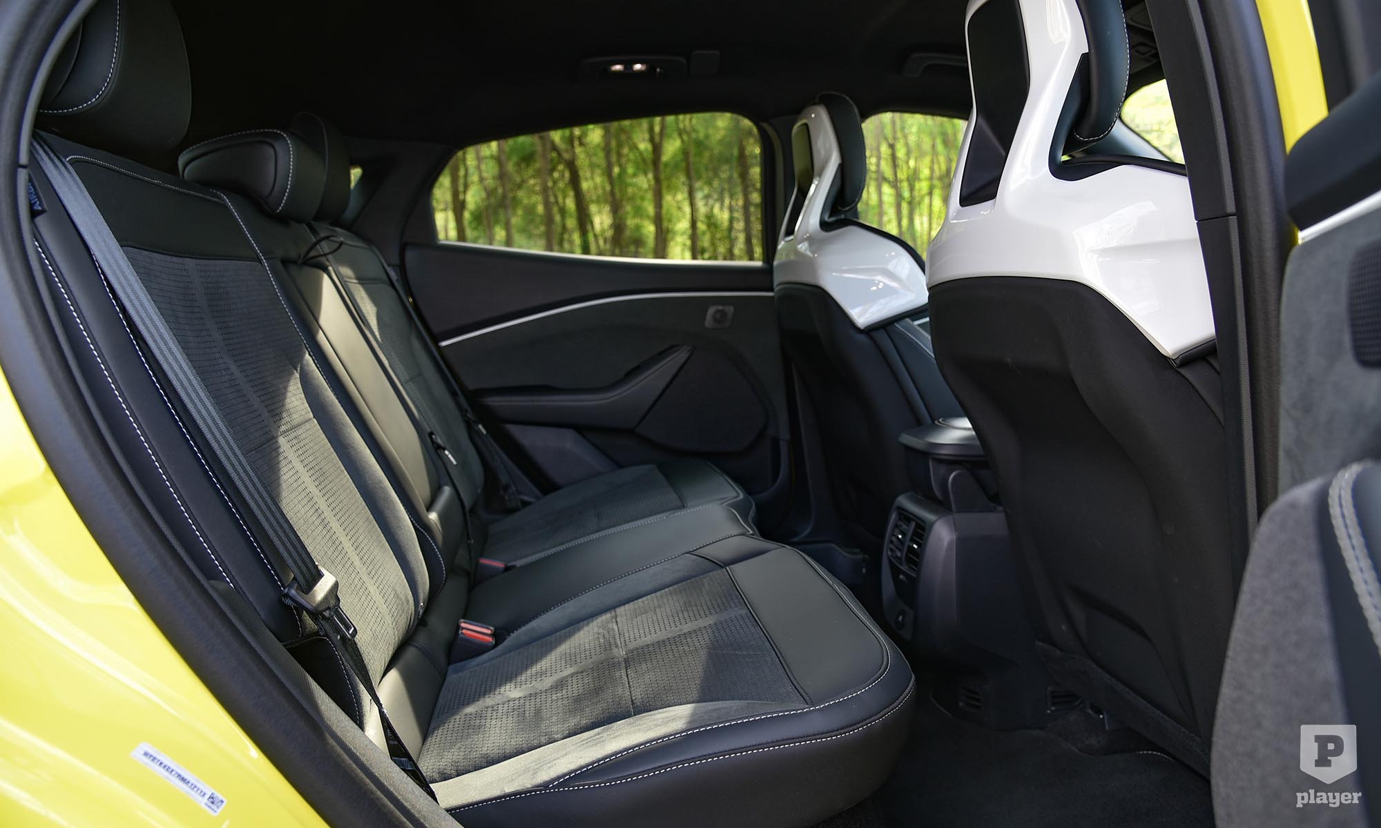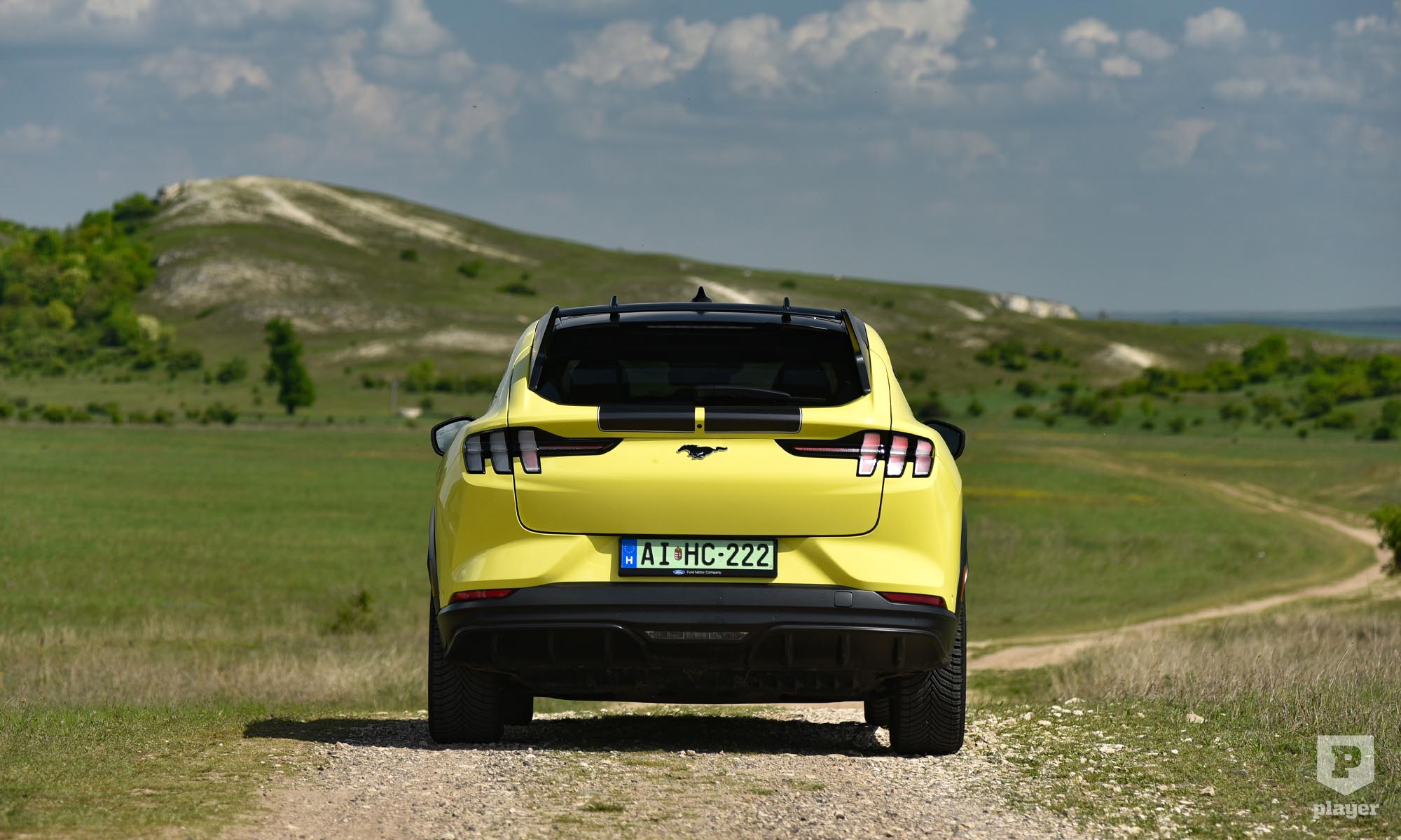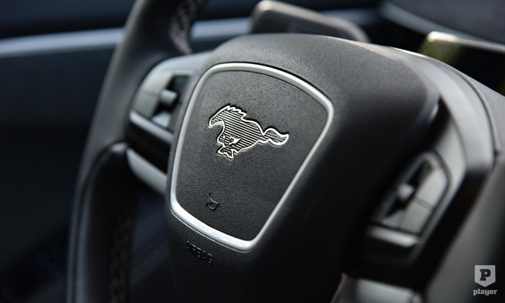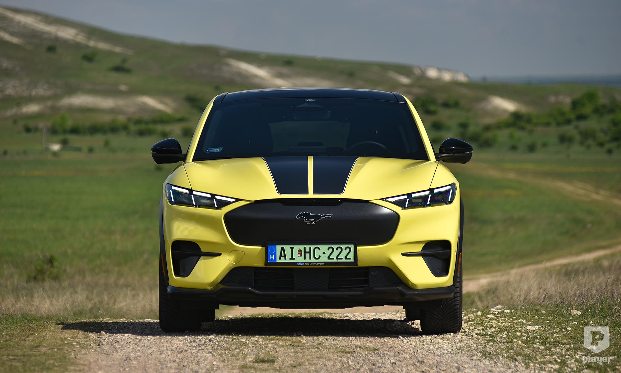 Becsületükre legyen mondva, amit lehetett, azt megtették a Fordnál, hogy ralis stílusjegyekkel dobják fel az elektromos Mustangot. A legfeltűnőbbek a murvás pályára szánt versenyautó-kerekekre hasonlító, fehérre fényezett teli felnik, amik annyira telik, hogy nem is látszik mögötte a Brembo féknyergek piros színe. A Focus RS ihlette a hatalmas hátsó szárnyat, és az egészet még feltűnőbbé teszi a gyorsítócsíkokkal ellátott Grabber sárga fényezés, ami ráadásul alapáron jár.