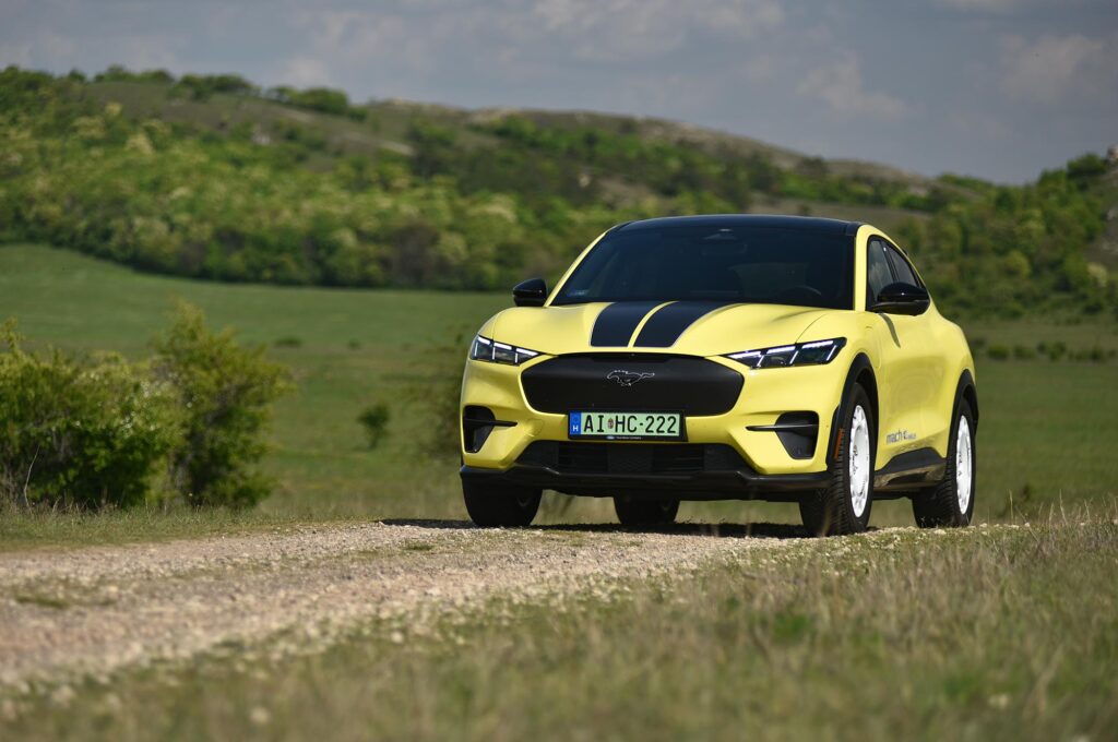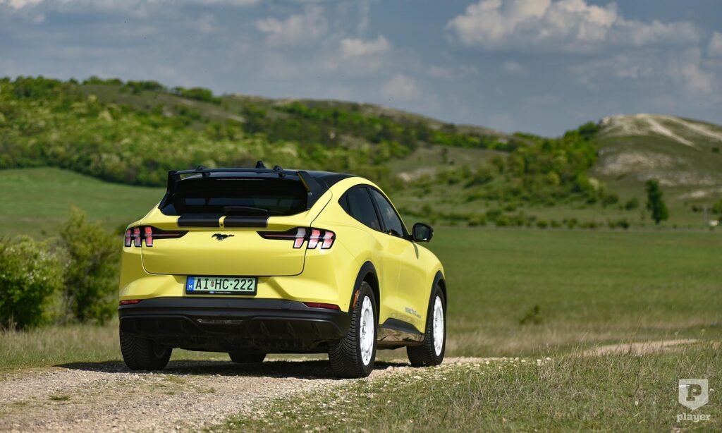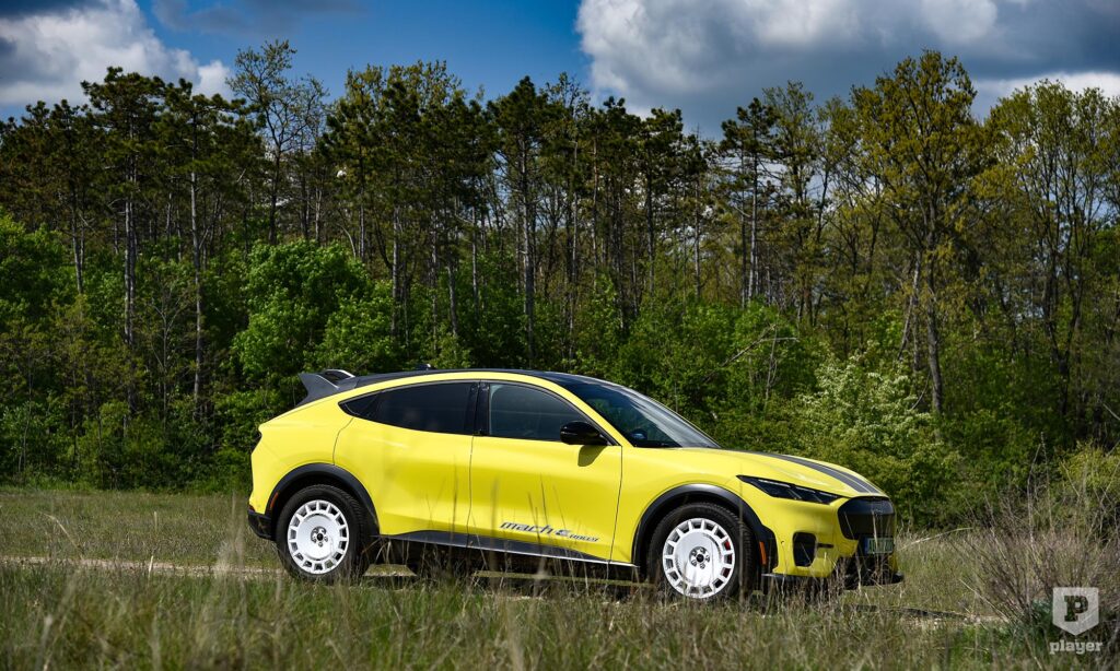 Azok a kollégák, akik csak aszfalton vezették, annyira nem értették, hiszen a többi Mustang Mach-E-nél magasabb építésével nem olyan feszes, mint amit egy versenyautó által ihletett sportmodelltől várnál. De nem is az aszfalt az igazi terepe, amit jól mutat, hogy a 19 colos kerekekre gyárilag kerültek rá