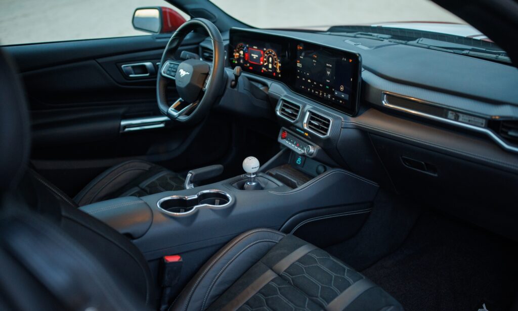 Határozottan modern lett az új Mustang utastere a két digitális kijelzővel, így szakított a tradicionális szimmetriával, de a mélyagyas kormány és a kézi váltó megmutatja, hogy az analóg örömök nem múltak el. A Super Snake-ben bőrrel és alcantarával kárpitozott sportülések vannak és fehér biliárd golyós váltógomb.